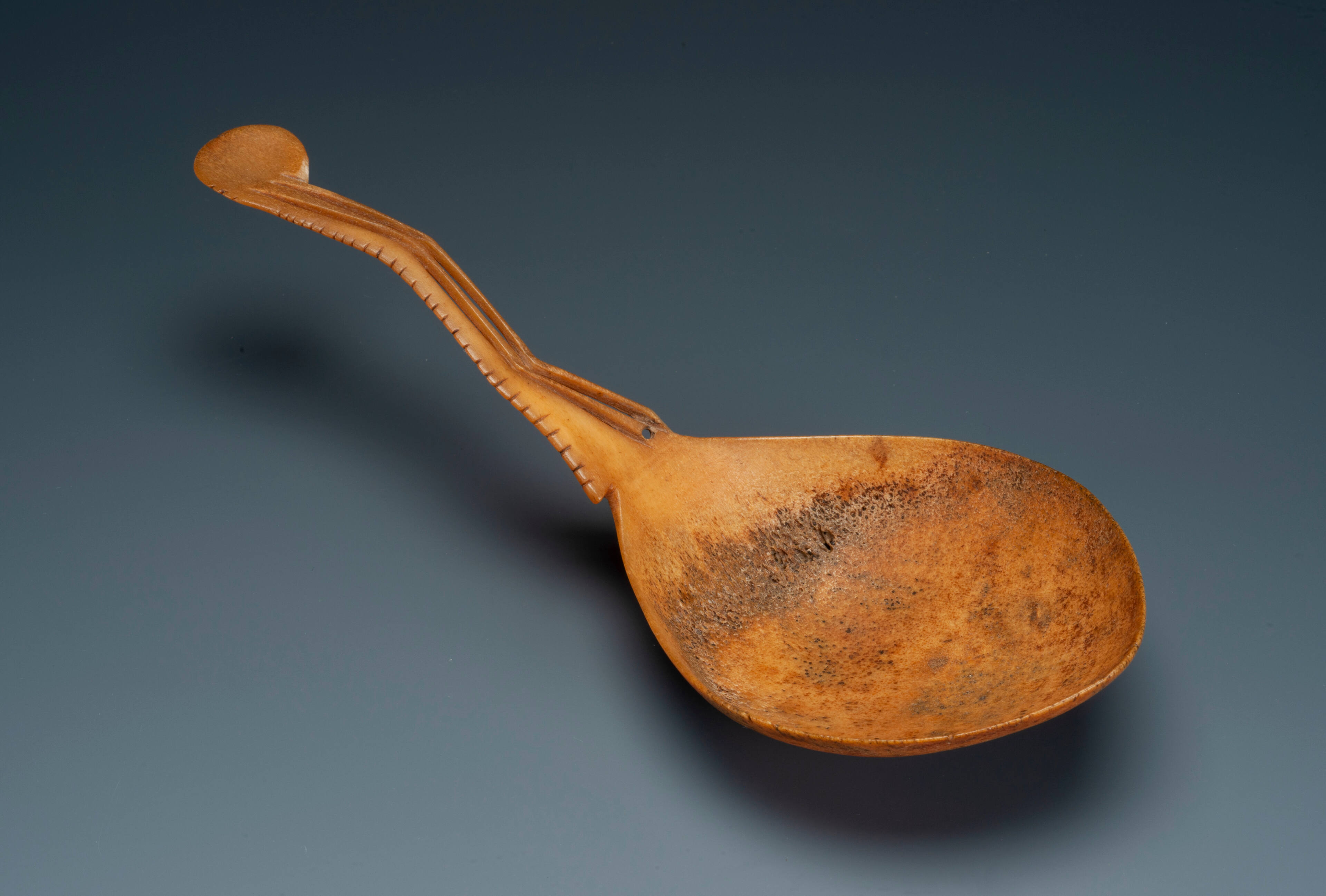 Label TextYurok, Hupa, and Karuk men used elegantly carved elk antler spoons to eat acorn soup at ceremonies and other important events. They made the spoons by cutting flat sections of antler and steaming them to make them flexible. Next, they cut out the spoon’s form and allowed them to harden. Finally, they fashioned abstract designs on the handle and smoothed the surface to an even finish.Exhibition History"Art of the American Indian: The Thaw Collection," The Cleveland Museum of Art, Cleveland, OH, March 2, 2010 - May 30, 2010; Minneapolis Museum of Art, Minneapolis, MN, October 24, 2010 - January 9, 2011; Dallas Museum of Art, Dallas, TX, April 24, 2011 - September 23, 2011; Indianapolis Museum of Art, Indianapolis, IN, December 4, 2011 - February 12, 2012.