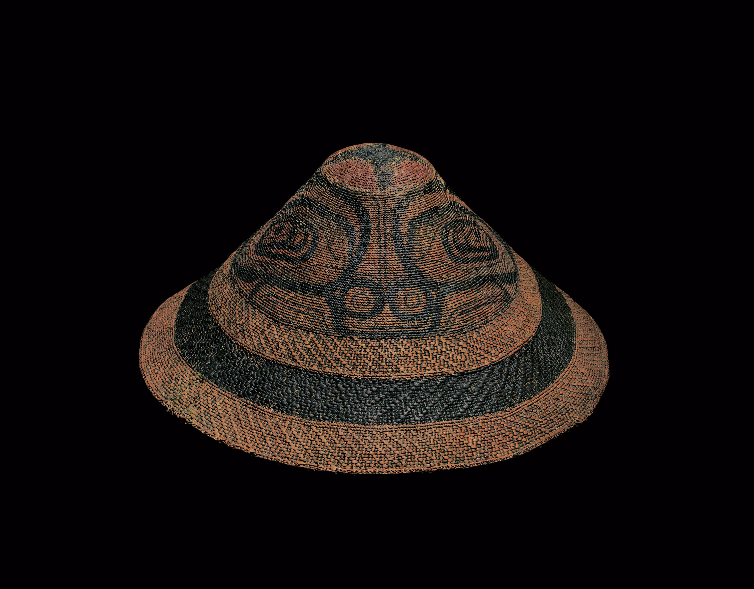 Label TextThe painting on the crown of this hat represents a highly abstract image of a whale. Women often created subtle surface patterns in their weaving and this hat has an understated pattern of diagonal parallel lines on its brim. Hats were respected clan heirlooms and were bestowed with prestigious traditional names.Exhibition History"Spirits of the Water: Native Art Collected on Expeditions to Alaska & British Columbia," Foundation la Caixa, Barcelona, January 1, 2000 - December 31, 2000.
