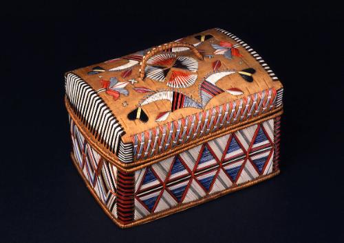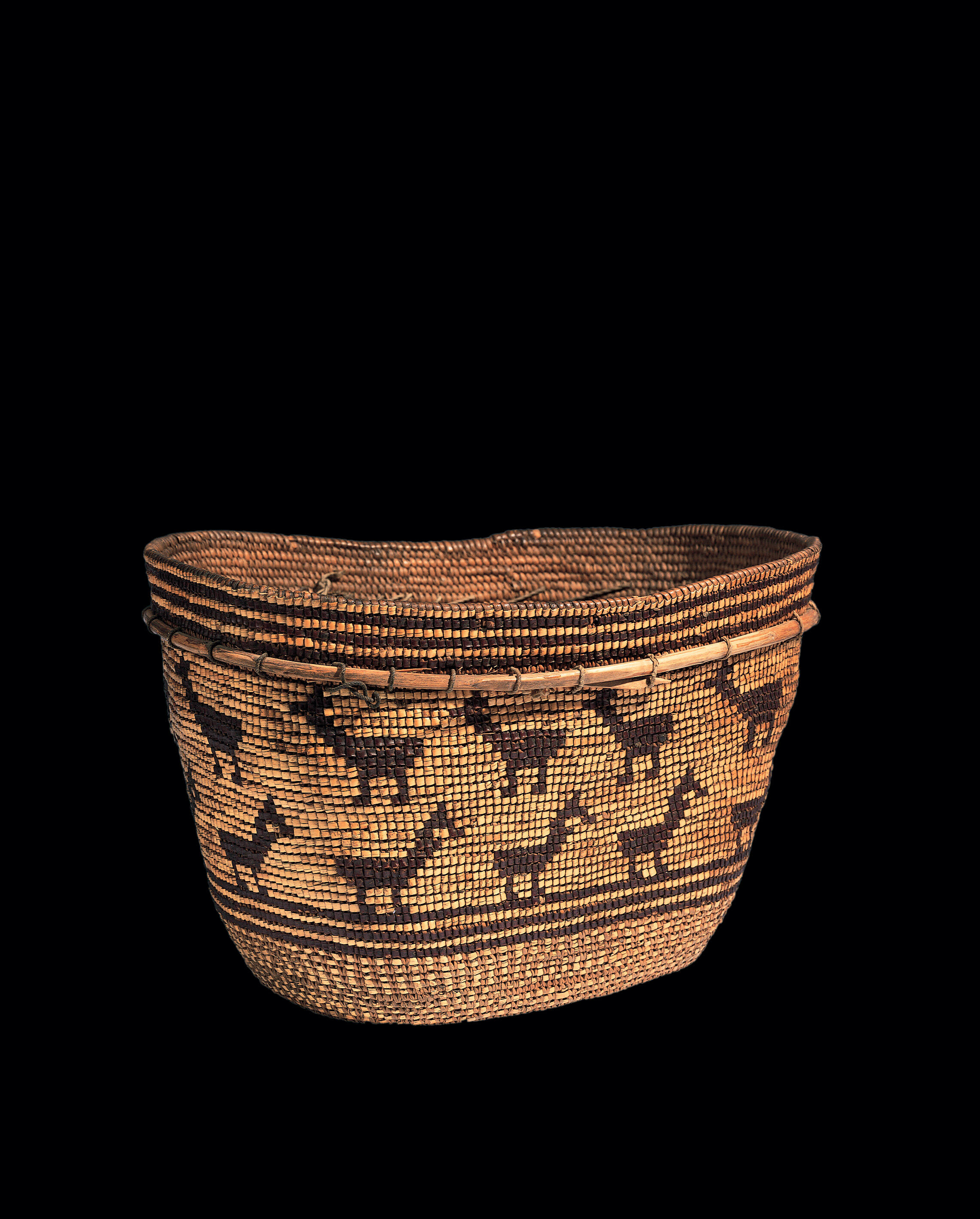 Label TextBurden baskets made from coiled spruce roots are a distinctive feature of the traditional culture of the Chilcotin, an Athabaskan-speaking people living in south-central British Columbia. These burden baskets were also artistic creations, combining technical skill, attention to detail, and compelling imagery. Decoration is with red cherry bark and yellow-white grass, applied through imbrication to the outer surface of the sides. A second decorative technique interweaving of grass with the spruce root stitching can be seen on the lower sides. A row of long-necked birds marches in orderly fashion along the bottom of this basket. Above them, a row of animals do the same but in the opposite direction The willow rod below the rim adds strength and support to the basket.ProvenanceNatalie Fay Linn, Portland, Oregon