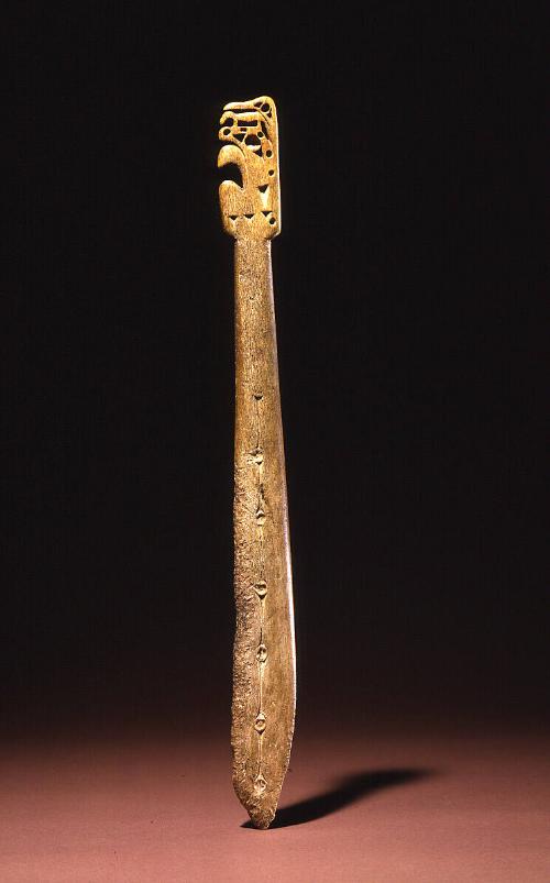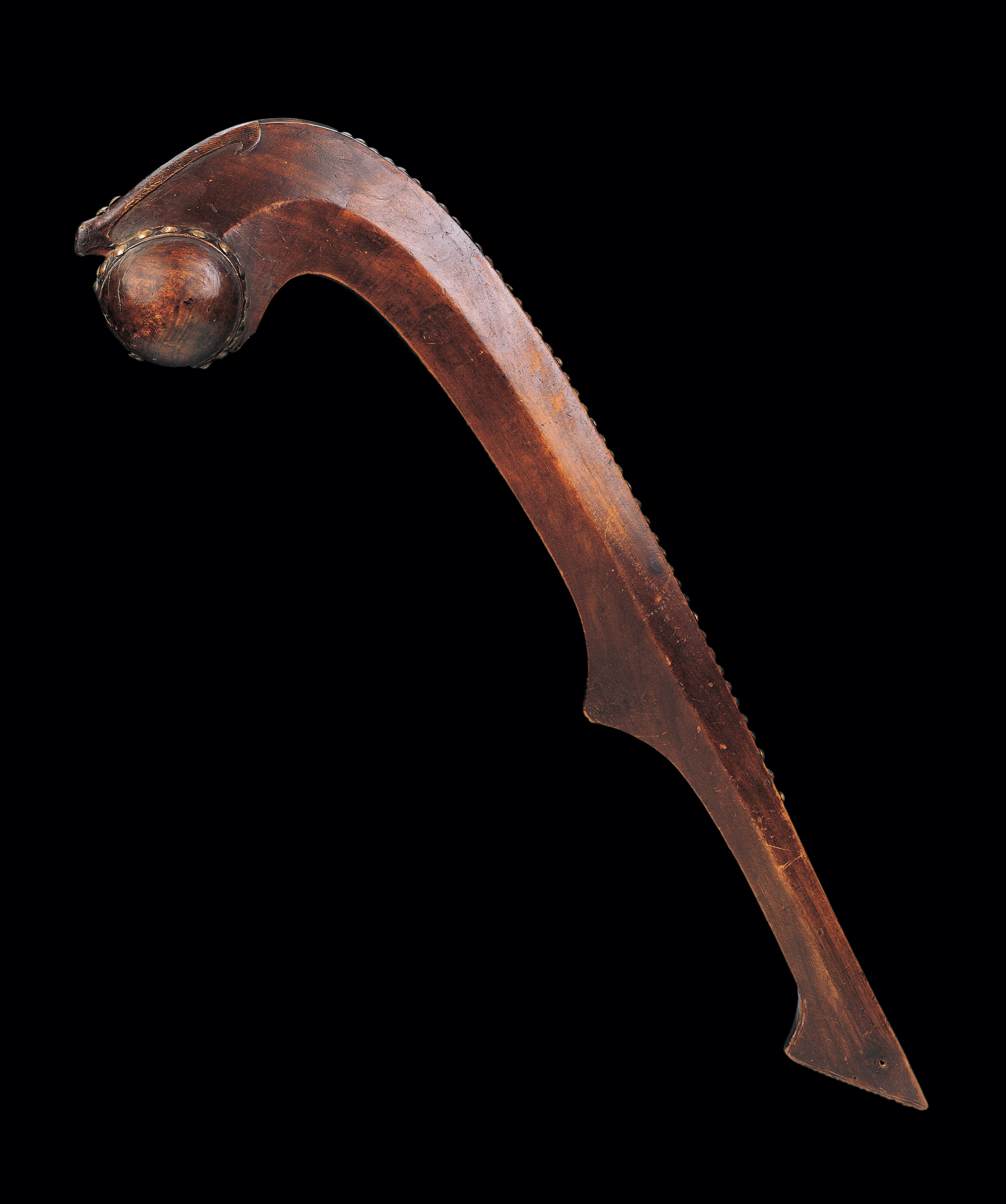 Label TextThis finely carved ball-headed club was a traditional weapon used in hand-to-hand combat. Warriors sometimes incorporated images of guardian spirits on their clubs to evoke spiritual power for success in warfare. An otter looks towards enemies from the head of this club, directly over its striking ball, and is perhaps also symbolic of the long-tailed Underwater Panther, the spiritual guardian of the underworld.Exhibition History"Art of the American Indian: The Thaw Collection," The Cleveland Museum of Art, Cleveland, OH, March 2, 2010 - May 30, 2010; Minneapolis Museum of Art, Minneapolis, MN, October 24, 2010 - January 9, 2011; Dallas Museum of Art, Dallas, TX, April 24, 2011 - September 23, 2011; Indianapolis Museum of Art, Indianapolis, IN, December 4, 2011 - February 12, 2012.