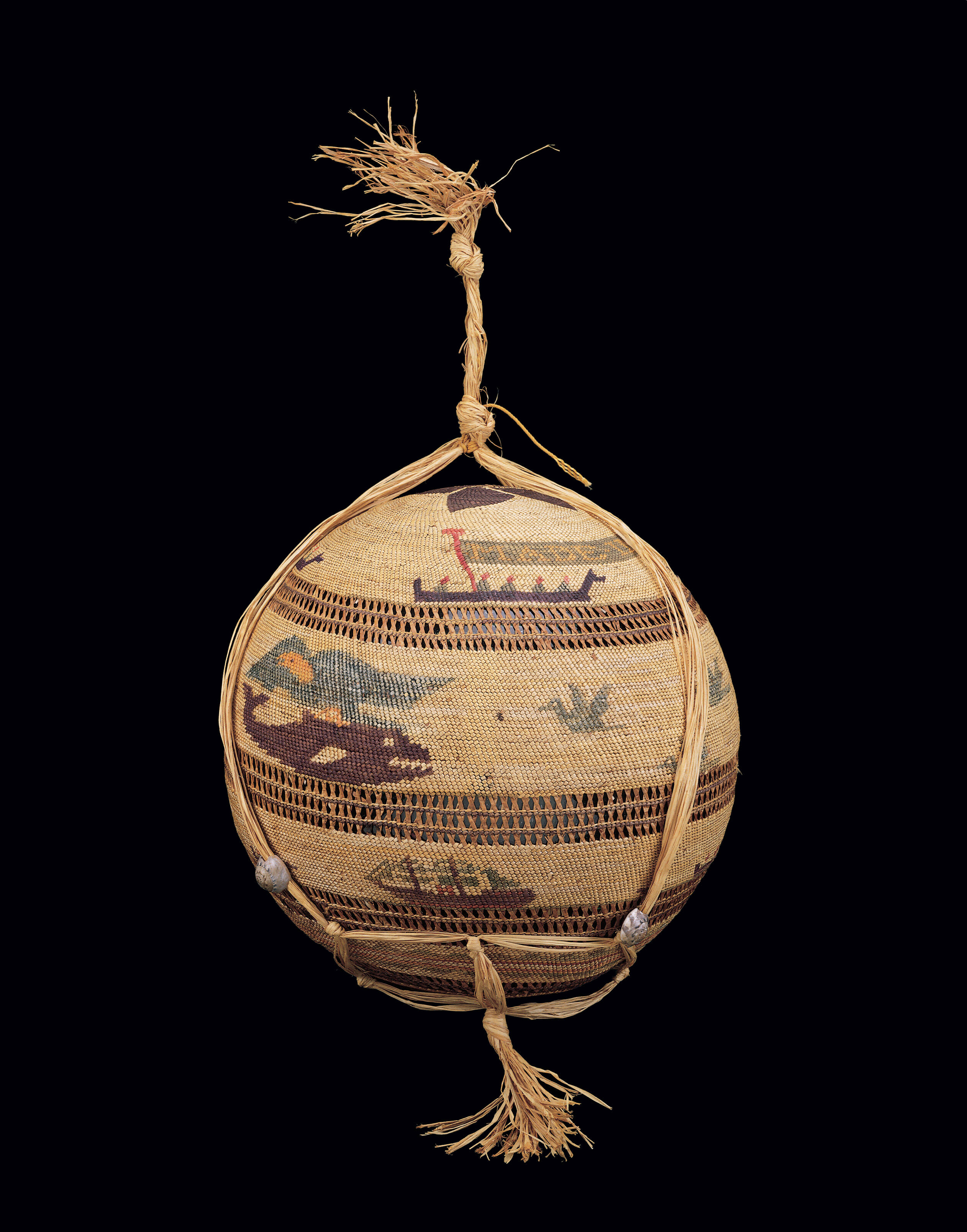 Label TextJapanese glass fishing floats were used by fishermen to suspend nets and were known to wash up on the shores of the Northwest Coast. A talented Nuu-chah-nulth weaver covered this float with finely woven basketry, depicting major symbols of Nuu-chah-nulth culture. The most prominent image is the thunderbird, a supernatural being that hunts whales. Several small Nuu-chah-nulth canoes carrying hunters on their quest are depicted near the top of the float. Basketry floats were not used in whale hunting but rather honor the tradition. On this float, the phrase “Made in Canada” serves as a memento for travelers and tourists, while the imagery celebrates one of the defining elements of Nuu-chah-nulth culture. Large basketry floats such as this one are very rare.ProvenanceNatalie Fay Linn, Portland, Oregon