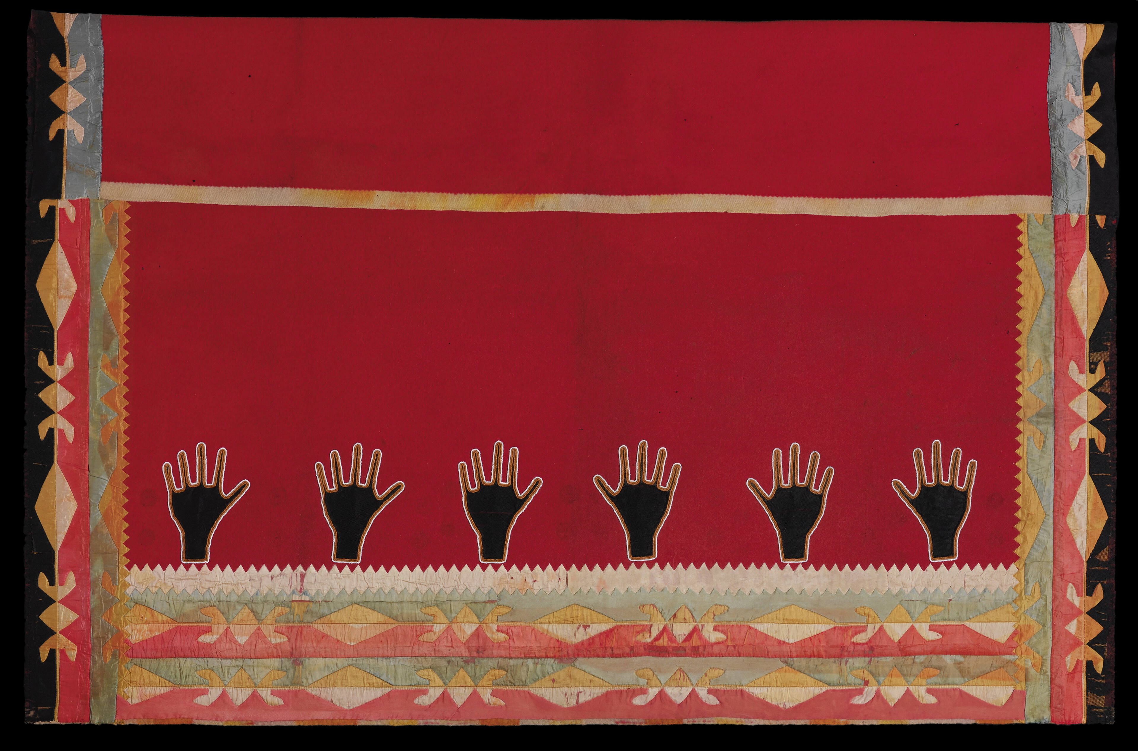 Label TextIn the early 1800s Wah-zah-zhe women began to sew mosaic ribbonwork patterns around the borders of wool blankets, transforming them into extraordinary robes. Women and girls wear these important garments at special occasions as emblems of their Wah-zah-zhe identity. The ribbonwork ranges from relatively simple bands of richly patterned reverse appliqué (a technique of sewing a cut-out ribbon pattern onto a differently colored ribbon background) to figurative designs, such as seen here. This type of blanket was worn around a woman’s shoulders and over her forearms so the ribbon-work formed a cascade of color in front of her. The six black-hand motifs against a scarlet background in this blanket form a striking contrast to the stylized geometric ribbon-work patterns. Exhibition History"American Treasures from the Fenimore Art Museum," Society of the Four Arts, Palm Beach, FL, February 20, 2004 - April 11, 2004.