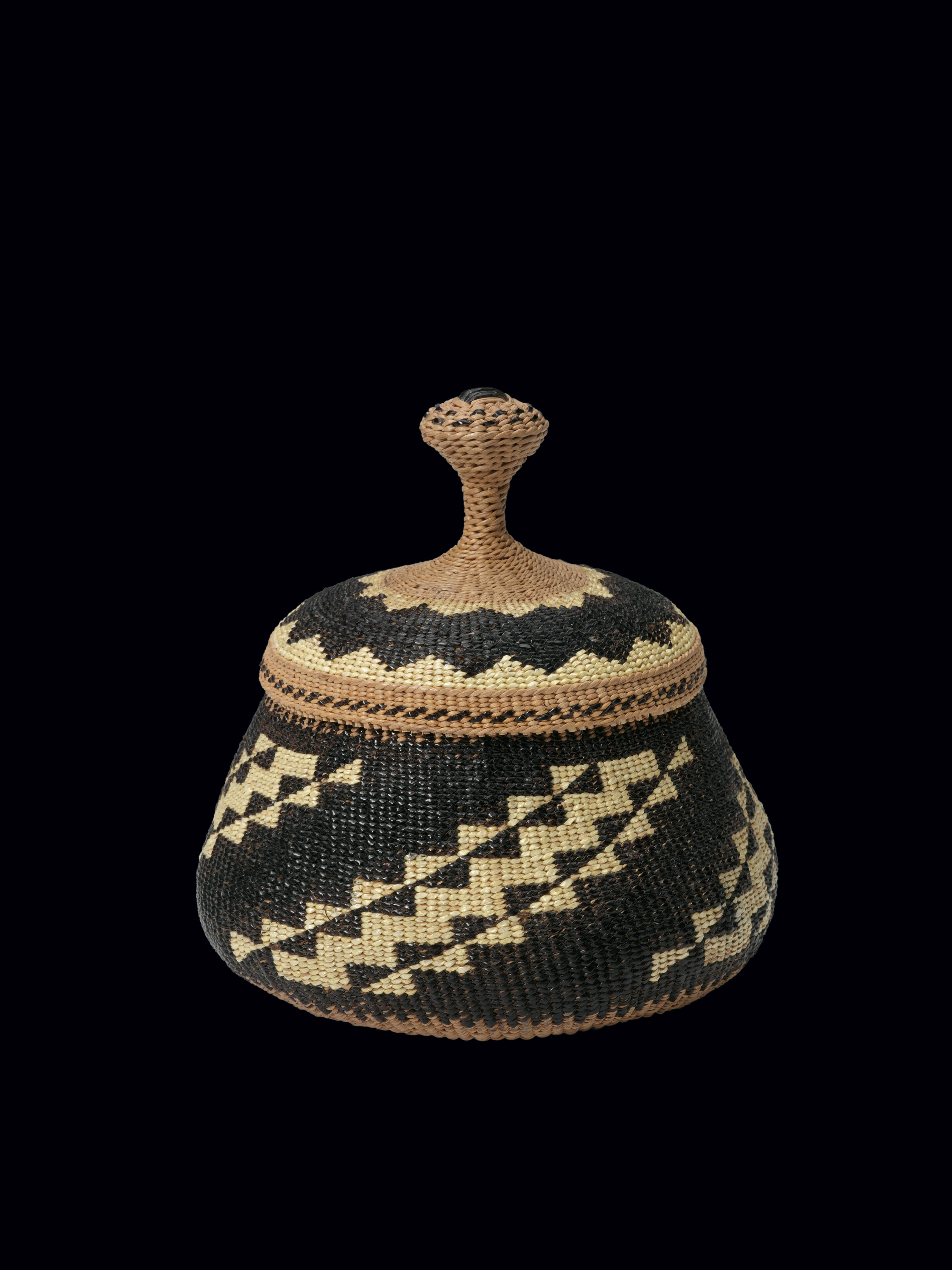 Label TextElizabeth Hickox’s command of aesthetics and her great technical abilities are clearly visible in this basket. Lidded baskets of various sizes were a specialty that she developed and represent perhaps her greatest work. Her classic designs, composed of yellow motifs on a black background, were achieved by overlaying the foundation with yellow-dyed porcupine quills and black maidenhair fern stems. In 1908 Hickox began to weave exclusively for Grace Nicholson, a Pasadena art dealer who specialized in Native American basketry. This professional arrangement continued until 1934.Exhibition History"Art of the American Indian: The Thaw Collection," The Cleveland Museum of Art, Cleveland, OH, March 2, 2010 - May 30, 2010; Minneapolis Museum of Art, Minneapolis, MN, October 24, 2010 - January 9, 2011; Dallas Museum of Art, Dallas, TX, April 24, 2011 - September 23, 2011; Indianapolis Museum of Art, Indianapolis, IN, December 4, 2011 - February 12, 2012.