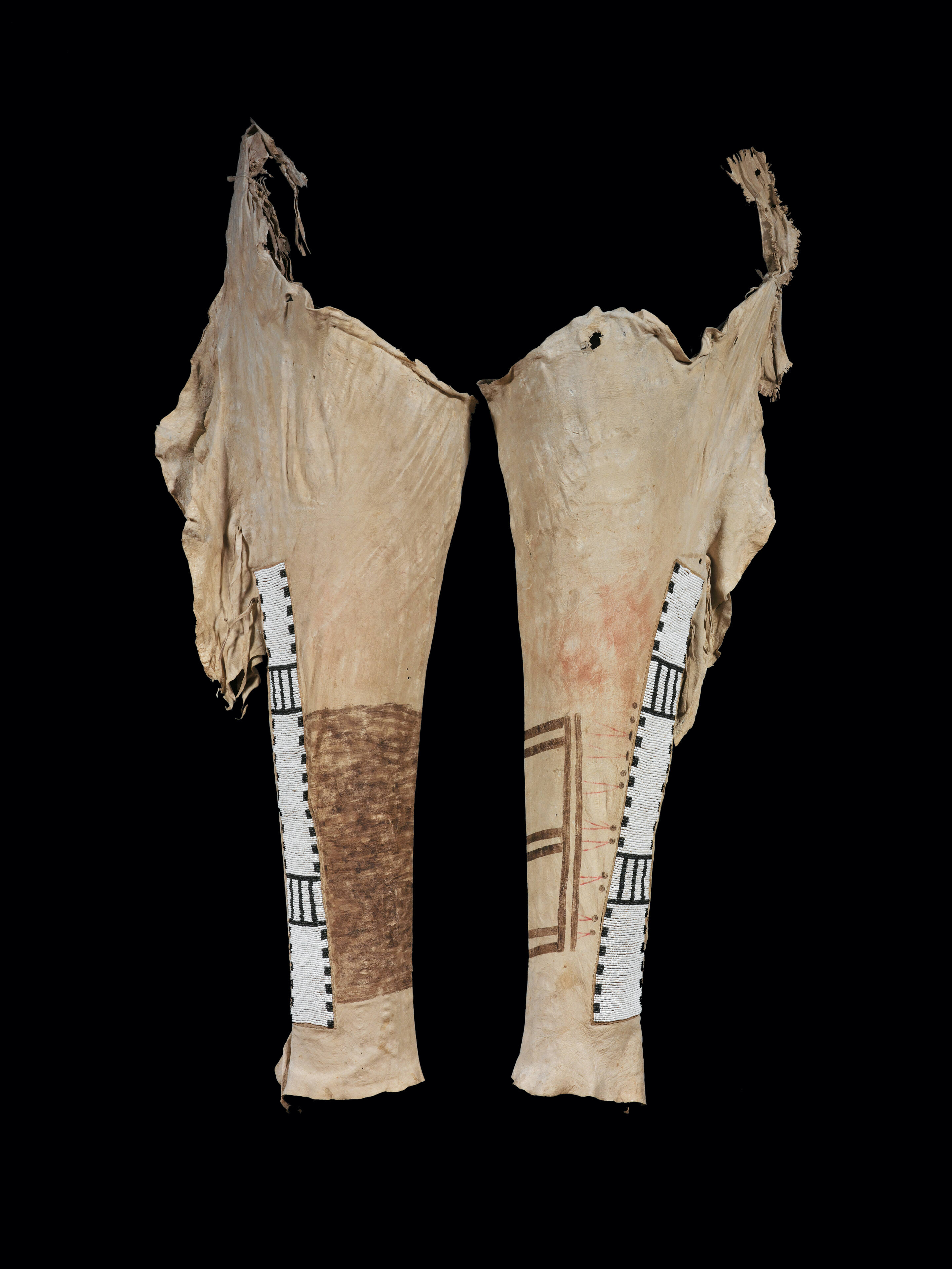 Label TextThese leggings illustrate the earliest expressions of Plains beadwork. In the early 1800s European glass beads were not readily available and their rarity was such that trade for 100 beads equaled the cost of a horse. The first beads to be obtained were pony beads, a fairly large sized bead that was replaced around 1850 with smaller seed beads. The beads were a new medium for the women and they translated their traditional geometric and abstract compositions in quillwork and paint onto their beadwork designs. The leggings are beaded and painted with symbolic markings that record the warrior’s accomplishments in battle.ProvenanceMorning Star Gallery, Santa Fe, New Mexico