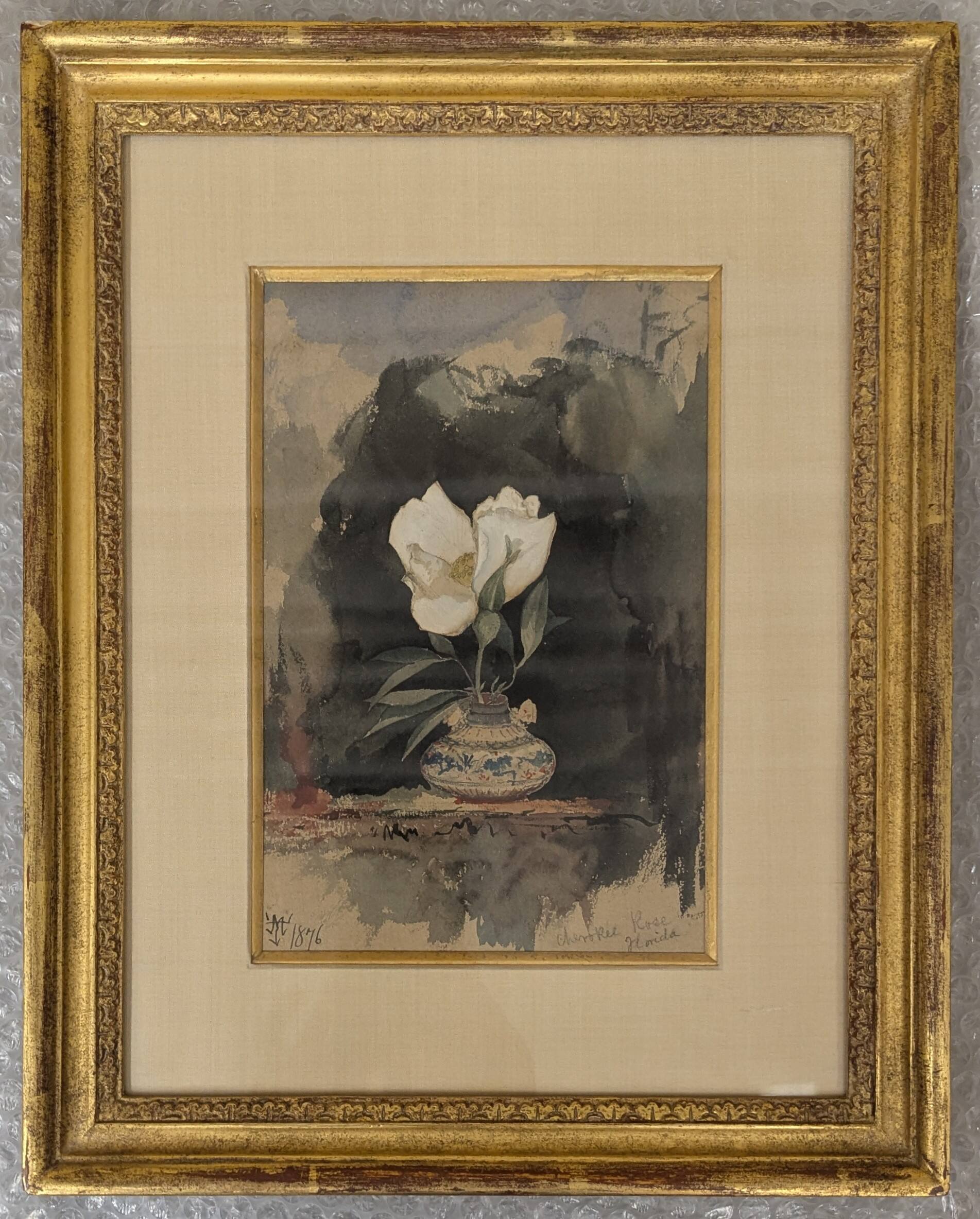 Label TextIn 1877 Thomas Moran traveled with his wife to Fort George Island, Florida. He had been hired by Scribner’s "Monthly Magazine" to illustrate an article about the Island, the small studies of trees and beaches as well as still lifes illustrating local flora, such as Cherokee Roses were a departure from his monumental landscapes of the American West. Moran signed and dated this work years after it was originally created. It’s interesting to note is that he dated it incorrectly, to 1876.On View