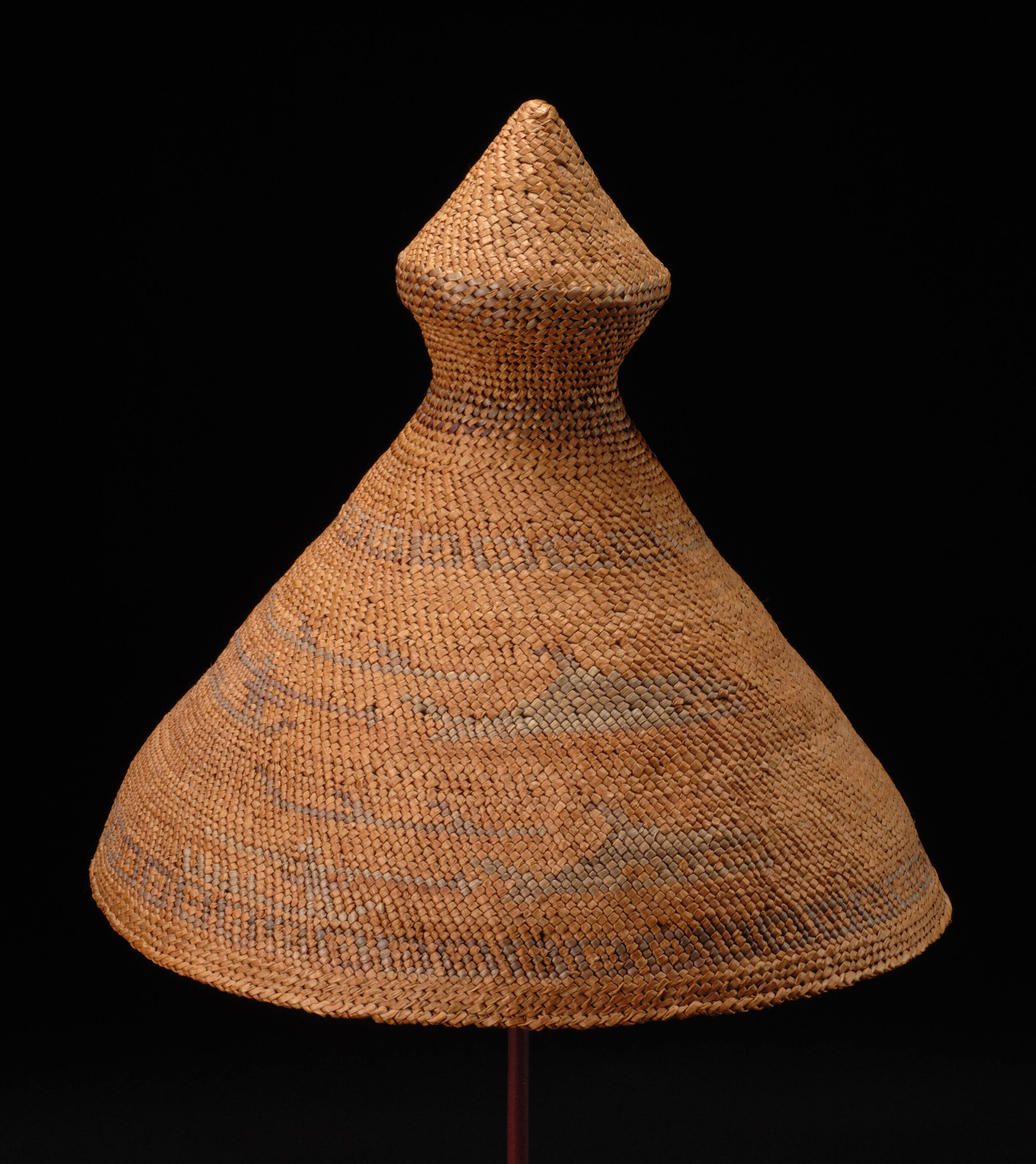 Label TextThis type of hat was worn by chiefs and whalers and is beautifully illustrated with two canoes manned by the whaling crew. In the front of each canoe stands the harpooner ready to throw his weapon. Above the canoes is sealskin floats used to keep the whale afloat after being harpooned. Once brought in to shore the whale was divided amongst the villagers in order of title and rank. The hat is constructed of a twined weave in cedar bark and natural and aniline-dyed grasses.ProvenanceBonhams, San Francisco, Sale 15419 Native American and Pre-Columbian Art, Dec. 3, 2007