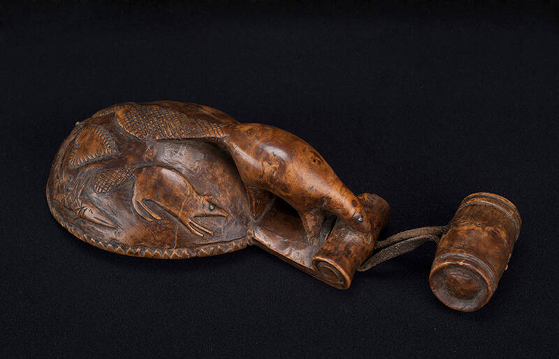 Label TextThis finely carved burl cup was used for drinking. The attached carved barrel was slung over the owner’s belt. The carving on the cup features two beavers, two sturgeon or pike, two hearts and a rosette. The imagery is a mix of Native American motifs and Canadian folk art-inspired hearts and rosette. The rum barrel on the belt loop may be a reference to the role of rum consumption in an annual ceremony of the White Panther cult where the rum provided the members with visionary experiences. There are two other belt cups by the same maker in collections in Canada and the United States.ProvenanceDevere A. Card; Betty Miller, Ilion, New York; Buzz Hesse, Otego, New York
