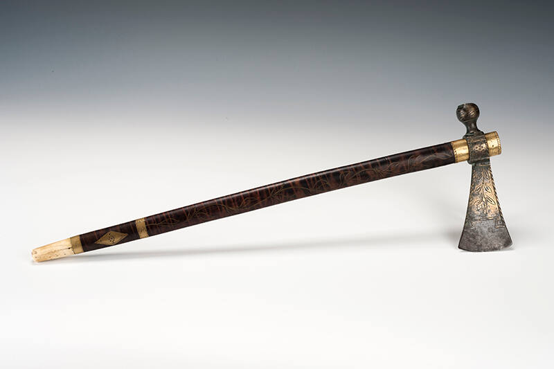 Label TextTomahawk pipes were important trade items. They combined the function of a hatchet and a pipe. This elegant pipe tomahawk was made in England for the American trade.