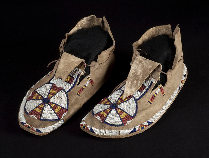 Label TextThese split tongue animal hide moccasins are made in classic Tsitsistas design. The elegant bead work disk is the four direction symbol. The cardinal directions are sacred to the Tsitsistas as demonstrated by the use of the four holy colors; red, white, black, and yellow each associated with a direction. The use of the symbolism and colors in the moccasins was to give power to the wearer during ceremonies.ProvenanceHarold Buckingham, Jr.