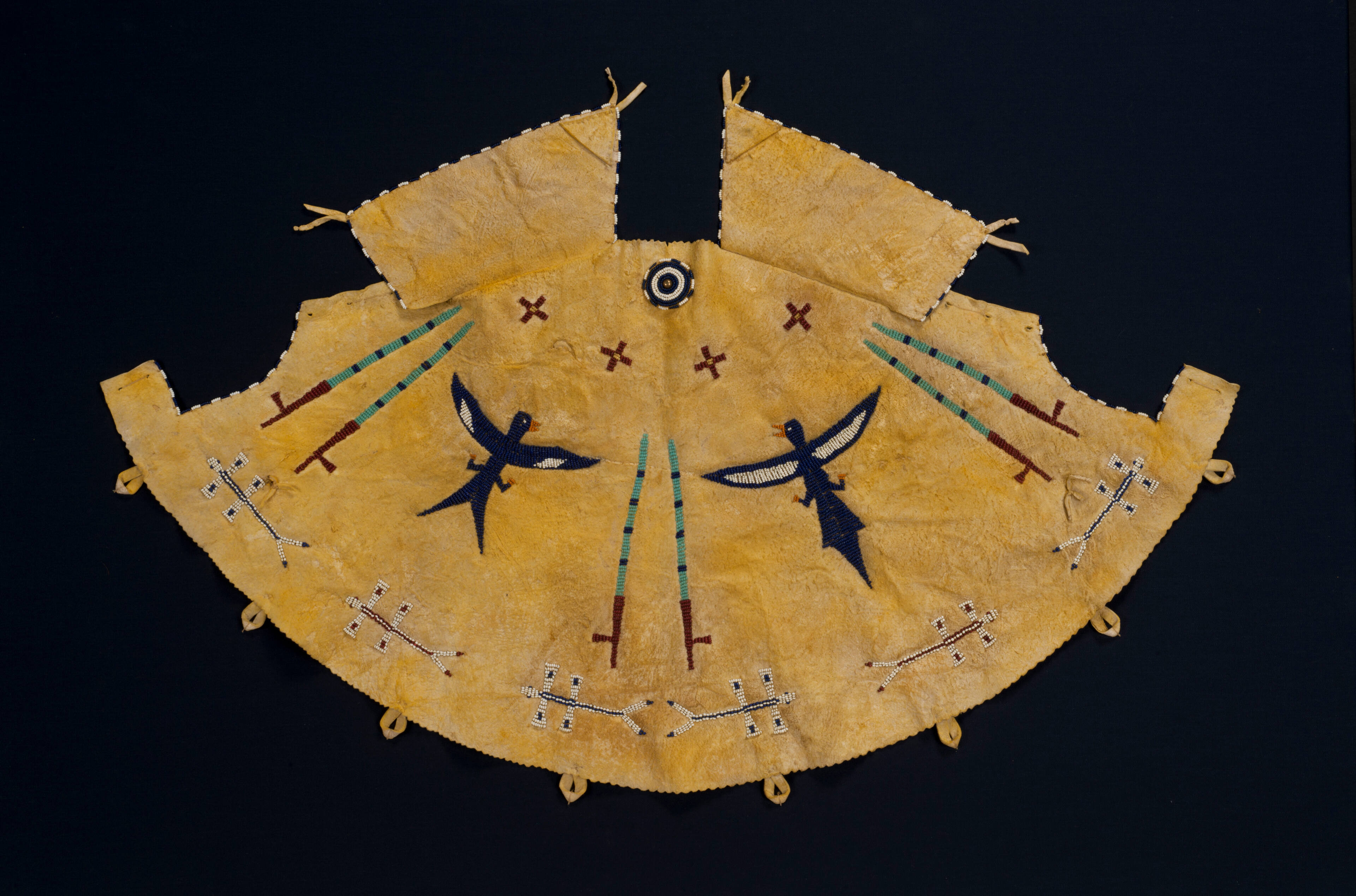 MediumHide, yellow-ocred beads, white, yellow, red, blue, turquoise, orange, thread, bead (metallic)