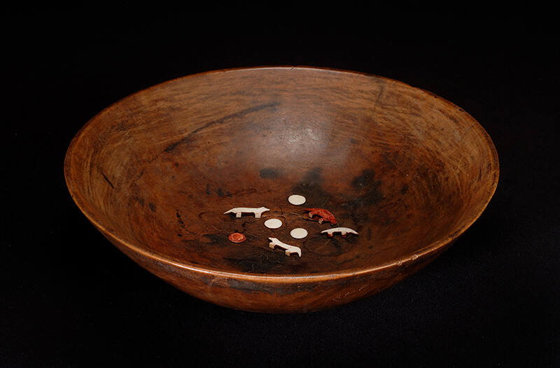 Label TextThe Ojibwa had many uses for finely carved bowls. Although most bowls were commonly used as food containers, some bowls were specifically used for gambling games. The high polish of the bowl’s surface and its good condition suggests the value that it held for the family, likely being passed down from generation to generation. The bone playing pieces in the shape of bears, foxes, and discs were dyed red on one side and left white on the other.ProvenanceMilford Chandler, Chicago, Illinois; Norman Hurst, Cambridge, Massachusetts; Steve Eich, Taos, New Mexico