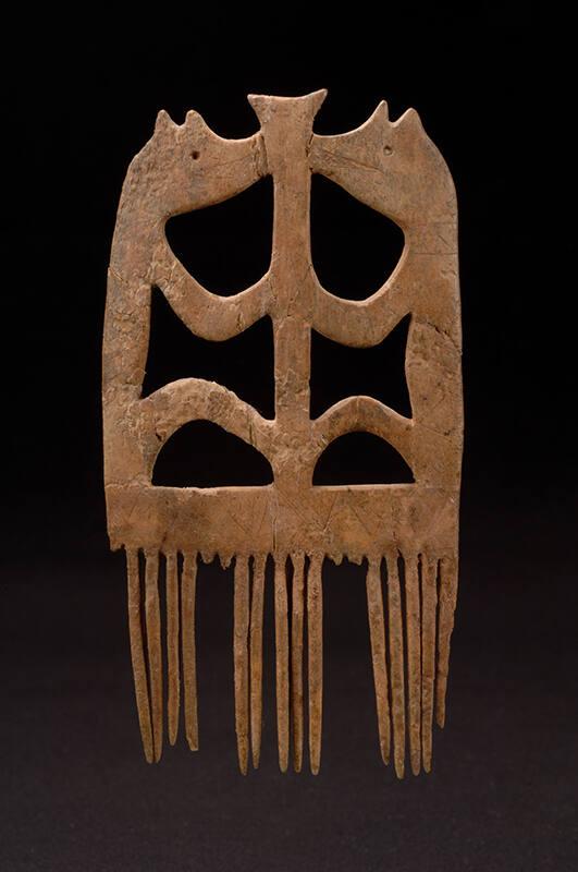 Label TextSince late prehistoric times Haudenosaunee artists carved effigy-decorated combs made from wood, bone and antler. The combs were worn by men, women and children. After the introduction of metal tools in the 17th century, the carvings became more elaborate with finely cut teeth. The carvings reached their peak in development between 1650 and 1700, after which they slowly went out of fashion.