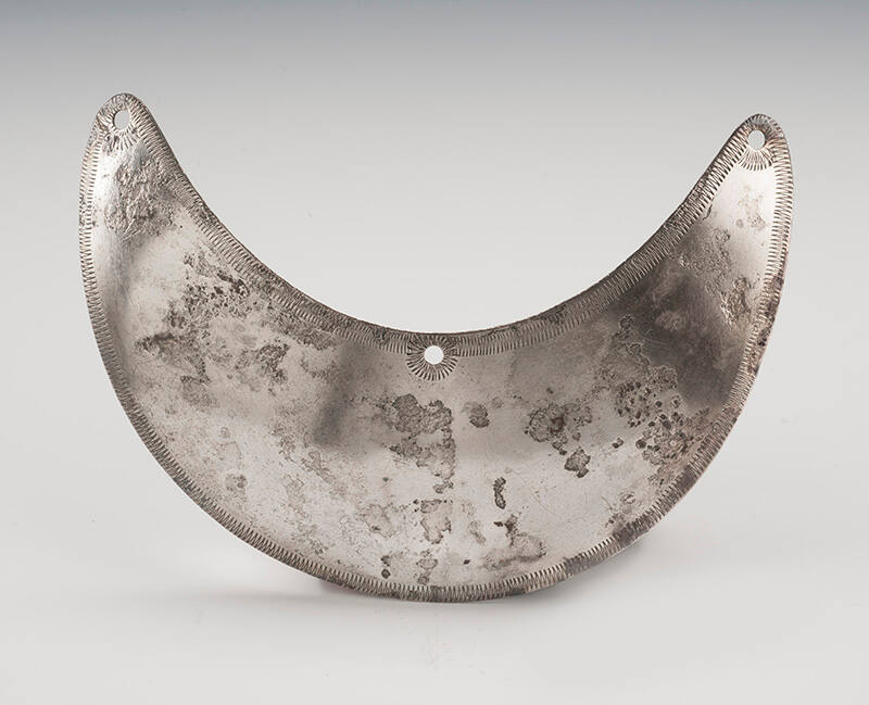 Label TextSilver adornment was important to the fur trade during the 18th and 19th centuries and became an important part of Native / European relations for several centuries. Silver jewelry was produced for the Indian trade by Colonial silversmiths. Native leaders received crescent-shaped gorgets as symbols of alliances, as well as in trade, and wore them hung around the neck.ProvenancePeter Tillou, Litchfield, Connecticut