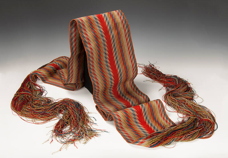 Label TextWendat (Huron) sashes, or ceinture fléchée, are created by using a fingerwoven technique similar to braiding. Sashes are sometimes interwoven with white beads to create a contrast in color and texture. The fringe is often twisted together or braided at the top while the end is left long and loose. The richly colored and patterned sashes were worn everyday, with fine ones reserved for formal dress.Exhibition History"A Century of Collecting: Selections from the Collections of NYSHA," Fenimore Art Museum, Cooperstown, NY, April 1, 1999 – October 1, 2000.