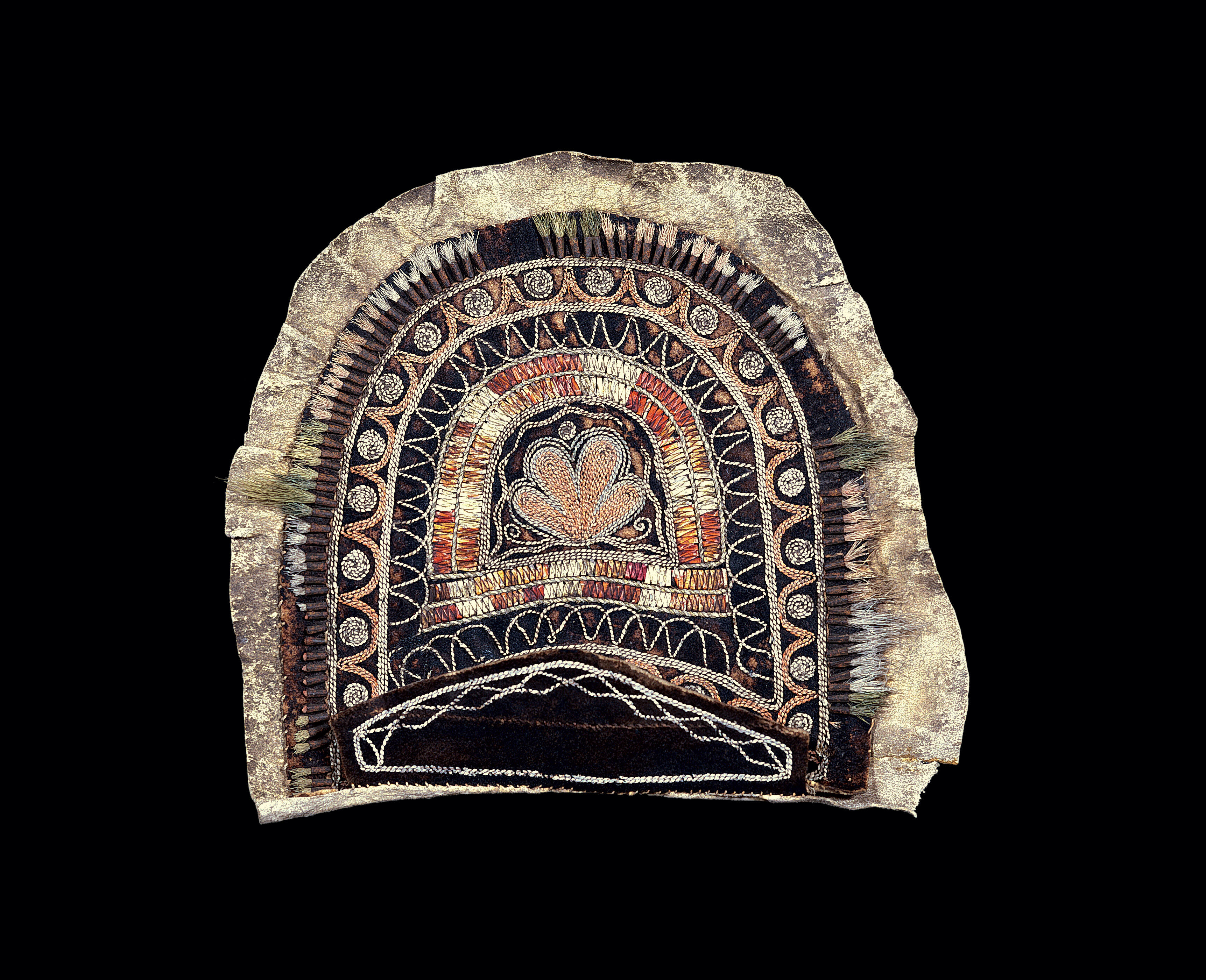 Label TextDelicate embroidery of moosehair on black-dyed deerskin is a distinctive art form of the Wendat (Huron) of Lorette, Quebec. Pouches, moccasins and gloves were among the types of objects that the Huron embroidered with stylized floral motifs and geometric elements such as the arc-and-dot or sky dome motif which is thought to be a reference to the great dome of the sky. Originally the pouch would have had a shoulder strap. As well, a number of tin cones are missing and the remaining ones have lost much of their brightly red-dyed moosehair. The extension of hide around the edge acted as a support for these inch-long tufts of red-dyed hair.Exhibition History"Arrows of the Spirit: North American Indian Adornment from Prehistoric to Present," Mingei International, San Diego, California, August 27, 1999 - April 1, 2000.