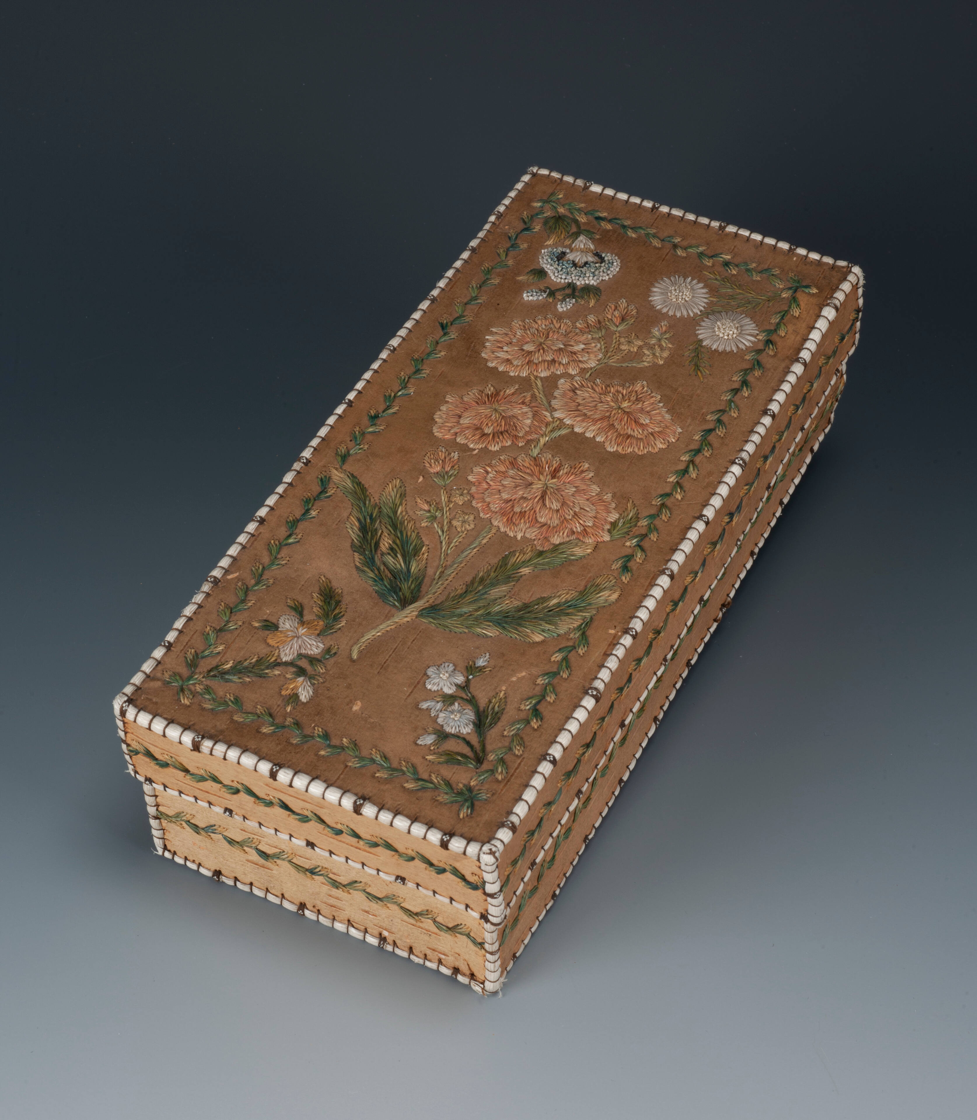 Label TextNative peoples in the Eastern Woodlands used birchbark and moosehair for decorative and utilitarian purposes, but not in combination with each other. Around 1700 Ursuline nuns working at Quebec convents used the two materials together to create finely made objects such as containers, trays and model canoes. The nuns were well-schooled in French embroidery techniques and are thought to have been responsible for introducing floral imagery to the young Native women whom they were teaching at the convents. At the turn of the 19th century Wendat (Huron) women took over this art form and were widely known for their intricate work.Exhibition History"Art Des Indiens D'Amerique Du Nord Dans La Collection D'Eugene Thaw," Mona Bismarck Foundation, Paris, France, Somogy Editions D'Art, January 21, 2000 - March 18, 2000.
