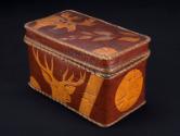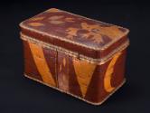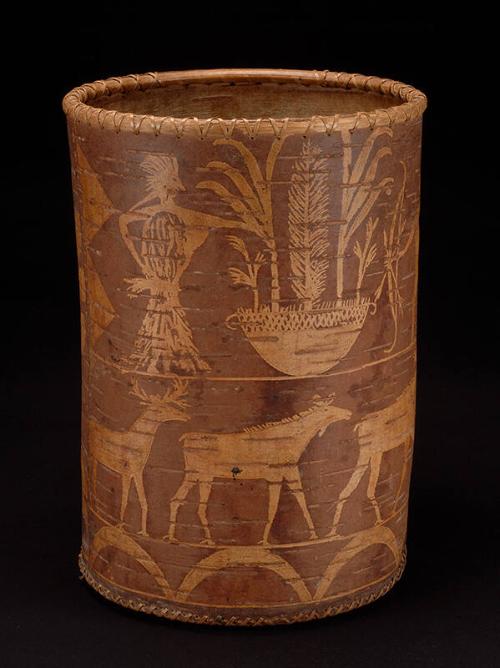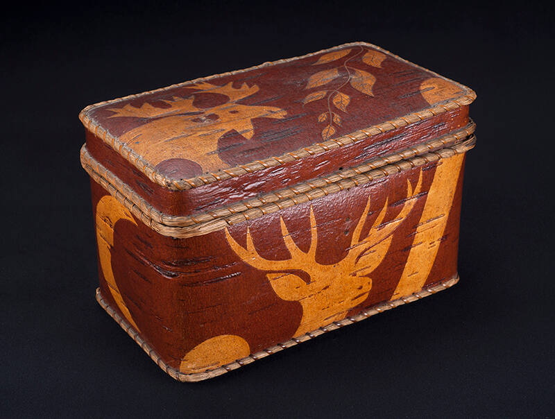 Label TextThe birchbark on this Penobscot box is decorated with a type of decorative technique known as sgraffito. The dark inner layer of birchbark is used as a surface that the artist then scrapes in part to reveal the light layer beneath. Here the image of a moose and a stag, two animals of great importance to traditional Woodlands economies, are realistically portrayed.ProvenanceWilliam Channing, Santa Fe, New Mexico