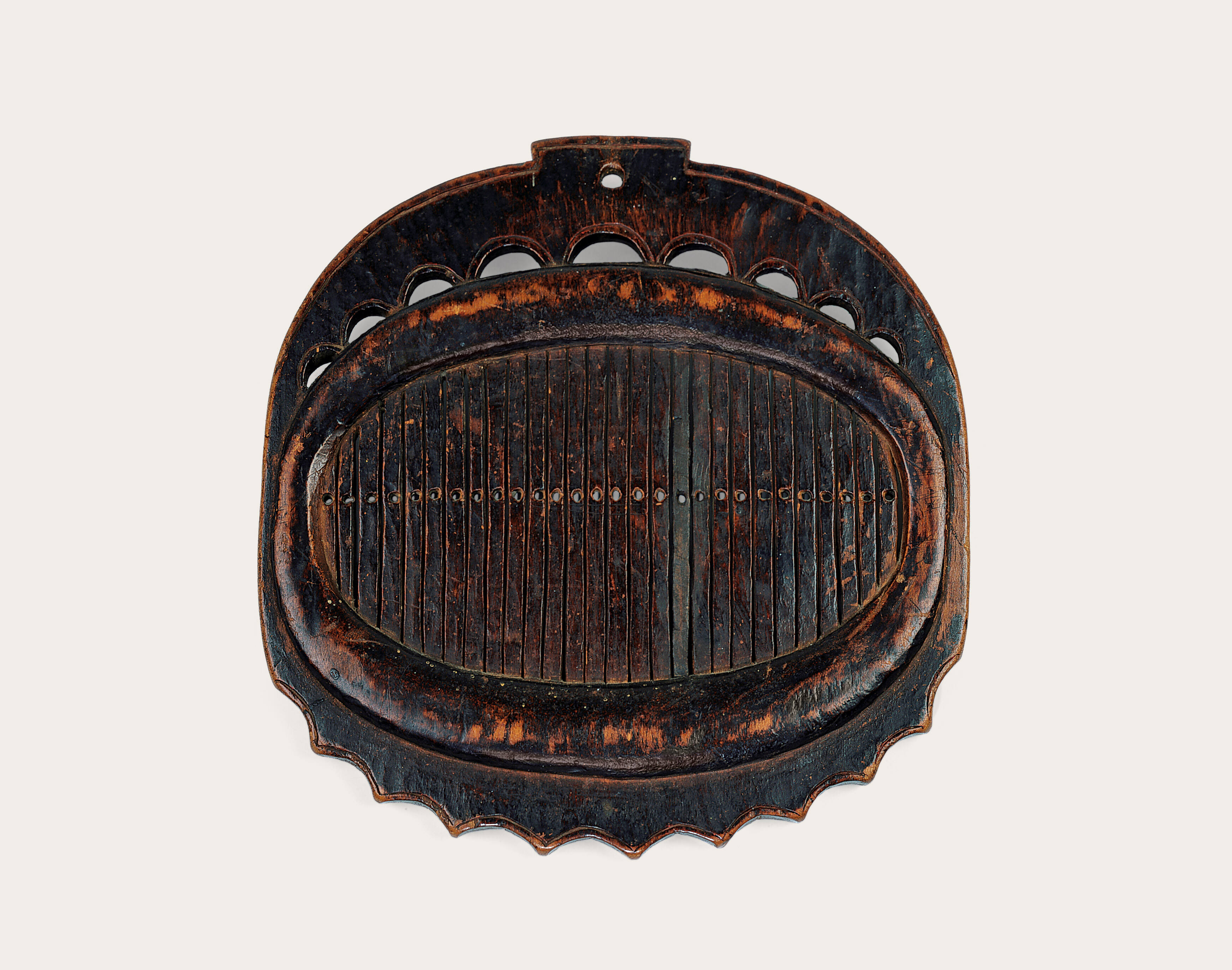 Label TextThis heddle, a device used in the loom-woven beadworking process, has two extremely stylized underwater panthers symmetrically framing its upper edge. The circle in the top center marks the division between the panthers’ heads. Their elongated bodies run the length of the upper edge and the graduated semi-circles indicate their legs. Their tails hang down the sides of the heddle and reach the wavy carving at the bottom edge, alluding to the watery depths where the panthers reside.ProvenancePaul Grey, Lebannon, Ohio; Donald Ellis, Dundas, Ontario