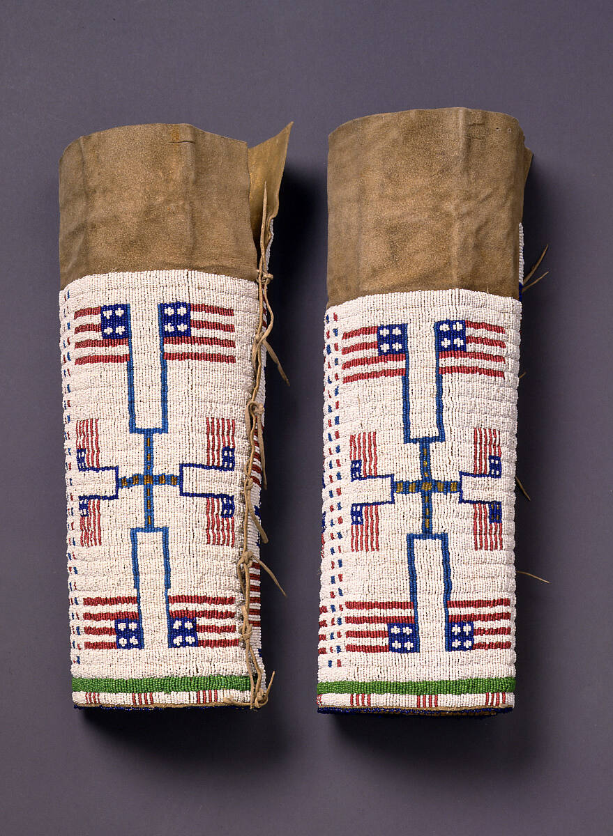 Label TextWomen's leggings of the Central Plains consisted of rectangular sheets of tanned skin that were wrapped around the lower part of the leg and sewn closed or tied with thongs like this pair. They were held up by means of garters below the knee. Cowhide was used as a substitute for buffalo or elk skin in the early Reservation period. Adopted as a symbol of courage and power, the American flag is waving in all directions on these leggings. It has replaced the symbolic designs relating to a man's war honors which often decorated his wife's leggings in former times. Beautifully decorated garments such as these leggings were made to be worn at Fourth of July celebrations. The use of metallic beads on these leggings was popular between 1885 and 1895. Decorated leggings were usually worn with moccasins beaded in the same pattern. (From the Catalog of the Thaw Collection of American Indian Art, 2nd ed.)Exhibition History"The Flag in American Indian Art," New Jersey State Museum, Trenton, NJ. August 30, 1998 - January 18, 1998; High Museum of Art, Atlanta GA. February 21, 1998 - June 13, 1998 Historical Society of Saginaw County, (Castle Museum), Saginaw, MI, August 1, 1998 - September 27, 1998; Houston Museum of Natural Science, October 1998 - March, 1999; Sheldon Memorial Art Gallery, Lincoln, NE. July 3, 1999 - August 29, 1999; Mashantucket Pequot Museum and Research Center, Mashantucket, CT, October 1999 – December 1999.