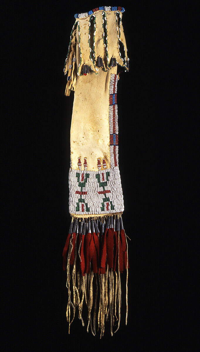 Label TextLong edge-beaded tabs around the upper rim of tobacco bags are characteristic of Tsitsistas/Suhtai (Cheyenne) design. (c.f. Penney 1992, figs. 93,111 & 112; Maurer 1993, figs. 83, 139 & 229) Although early examples usually have four tabs, bags from the 1860s and later tend to have more tabs below the beaded rim, such as this example. Beadwork on the lower part of the bag and the vertical strip covering the seam is done in a fine lazy-stitch technique. The stepped-triangle pattern is distinctive for beadwork of about 1890. The small elongated diamond shapes above the panel of beadwork represent eagle feathers and refer to sacred blessings. In contrast to these features of the late 19th century, the bottom fringe is old-fashioned. Many Tsitsistas/Suhtai bags do not have the panel of quill-wrapped strips that were so popular on the central Plains. Instead, tin jinglers and long fringes often start directly from the bottom of the bag. The strips of red cloth are seldom seen and appear to substitute for tassels of red-dyed hair. Among the Tsitsistas/Suhtai, the production of quill- and beadwork was restricted to women who were members of craft guilds. These organizations played a conservative role in the development of the tribal art style. (From the Catalog of the Thaw Collection of American Indian Art, 2nd ed.)Exhibition History"Art Des Indiens D'Amerique Du Nord Dans La Collection D'Eugene Thaw," Mona Bismarck Foundation, Paris, France, Somogy Editions D'Art, January 21, 2000 - March 18, 2000.