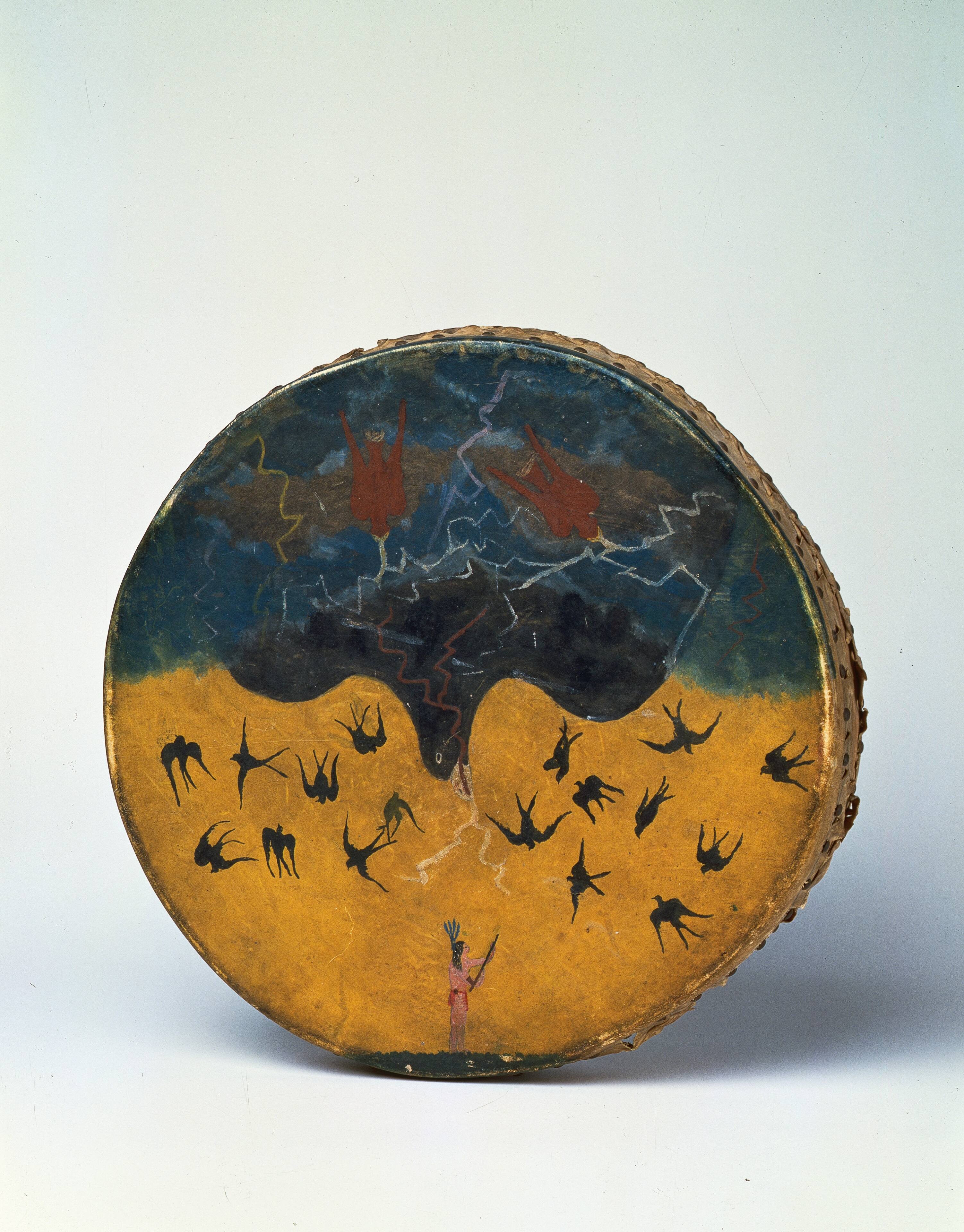 Label TextThis double-sided drum is painted on both sides of the rawhide. One side shows thunder clouds and a yellow sky full of swallows, who often herald the coming of thunderstorms on the Plains. In the black clouds two red birds also shoot lightning from their eyes, while down on the earth, a man offers a pipe to the Thunderbird. On the other side a white star is surrounded by a radiating yellow light, perhaps representing the Morning Star, a key figure in Pawnee creation stories. The white dots in the dark blue background overtly refer to the stars of the night sky, but can also be perceived as the hail associated with thunderstorms, another manifestation of Thunder’s powers.Exhibition History"The 45th Annual Winter Antique Show," New York, NY, January 12, 1999 – January 25, 1999.