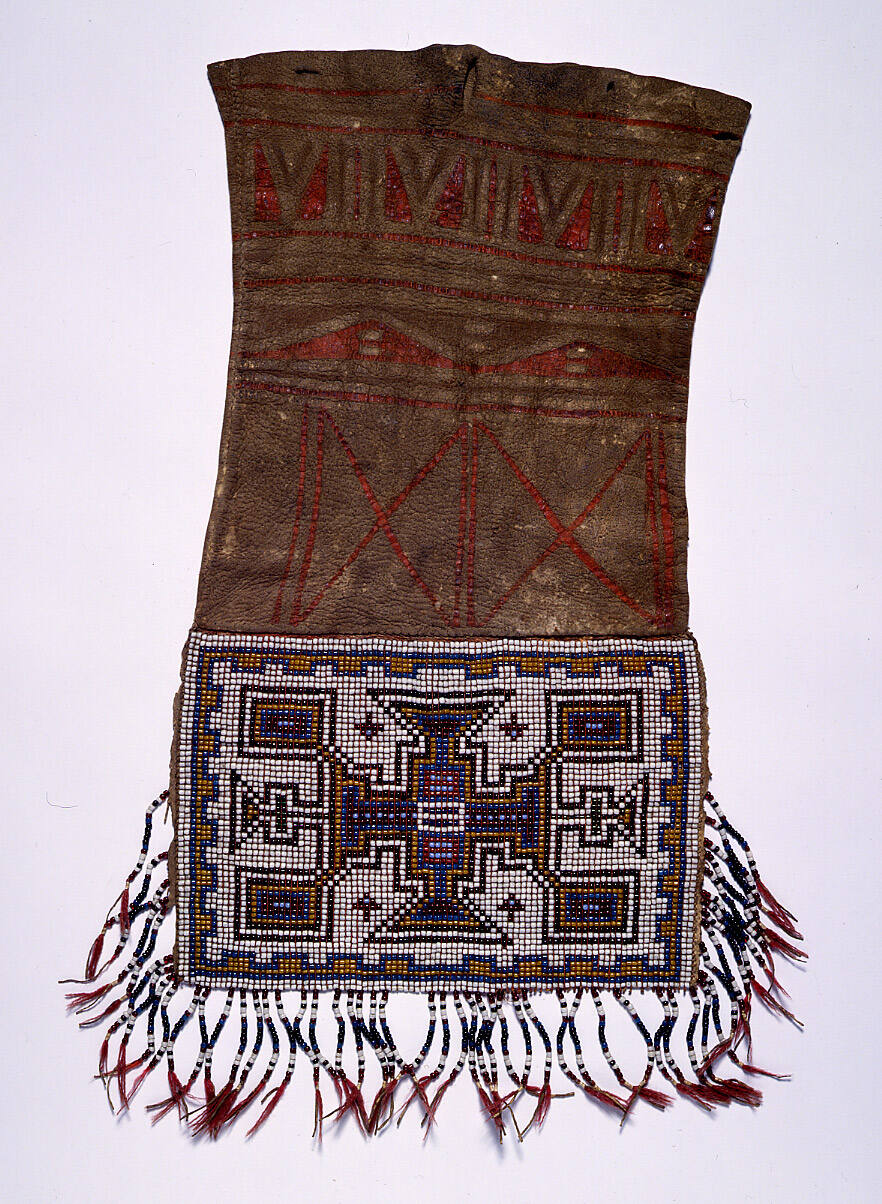 Label TextThis sinew-sewn rectangular flat pouch of painted buffalo skin with its bottom panel of loom-woven pony beads is an extremely rare example of a type of belt pouch that later acquired widespread popularity from James Bay westward to the Columbia River and the Yukon. The geometric paintings on this skin pouch are similar to those decorating long skin coats from the Manitoba region in 1780-1820 (c.f. fig. XX ); the buffalo skin itself narrows its origin down to the southern parts of that region. Pony beads of the early fur trade have been woven with sinew thread on a warp of red-ochred thin leather strings, reminiscent of Great Lakes and northeastern artifacts of the 18th century. Also the general construction of the bag is clearly derived from a painted and quill-worked prototype known to have been collected from the Great Lakes area in the 1720s. People raised in a Great Lakes art tradition apparently created this panel bag in southern Manitoba. The lower Red River valley in that region became a production center of such bags by 1830 and this example is an important and rare document in the transition from a Great Lakes tradition to a distinct variant to the northwest. The first distinctive feature of the Red River style is already present on this bag: the geometric pattern woven in the bottom panel. This design - a rectangle in the center, smaller rectangles in the four corners, and triangles between the corners - remained very popular for many decades to come.The exact identification of its producers is hampered by the heterogeneous composition of the Native population in southern Manitoba. By 1800 large numbers of Ojibwa from Minnesota had moved into this region, assimilating the local Cree and Assiniboine Indians. All regional bands, irrespective of their designation as Ojibwa or Cree, consisted of such mixed groups, some of them even including Ottawa Indians from Michigan. This early panel bag reveals the amalgamation of Cree and Ojibwa art styles that are at the root of the subsequent emergence of a distinct Red River style. (From the Catalog of the Thaw Collection of American Indian Art, 2nd ed.)