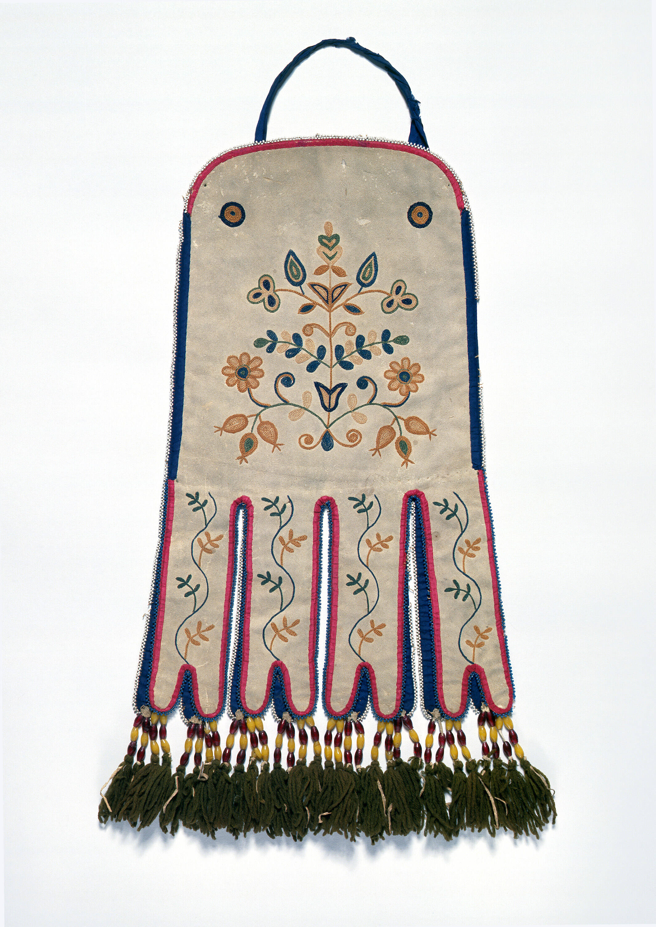 Label TextThis type of bag is popularly called an "octopus" bag because of the four long, fabric fingers that hang down each side at the bottom, like the eight tentacles of an octopus. They are referred to by scholars, however, as “fire bags” because they traditionally held a man’s fire-making apparatus, a flint and steel. Today they are used mainly as regalia for dances, pow-wows, or other special occasions. The fine floral quillwork, different on each side of the bag, is typical of the work done by the Metis during this period.Exhibition History"Art of the American Indian: The Thaw Collection," The Cleveland Museum of Art, Cleveland, OH, March 2, 2010 - May 30, 2010; Minneapolis Museum of Art, Minneapolis, MN, October 24, 2010 - January 9, 2011; Dallas Museum of Art, Dallas, TX, April 24, 2011 - September 23, 2011; Indianapolis Museum of Art, Indianapolis, IN, December 4, 2011 - February 12, 2012.