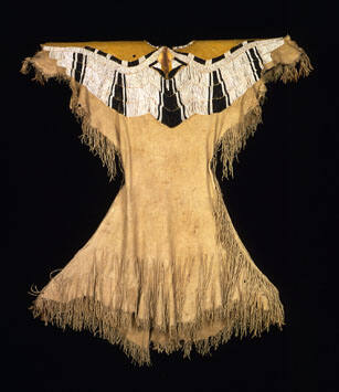 Label TextThis striking dress is made from two large deerskins, their hindquarters forming the top of the dress, neck and forelegs used to make the lower part. A tail was retained at the front just below the neck, giving such garments their common name of “deer tail” dresses. The striking yoke is decorated with the large early trade glass beads called “pony beads” made in a limited range of colors, predominantly blue, red, and black and fashion a dramatic effect. The attached long slender fringe at the bottom creates a sense of elegance.Exhibition History"Sacred Encounters: Father De Smet and the Indians of the Rockies," Museum of the Rockies, Montana State University. Bozeman, MT, April 3, 1993 - May 1, 1995.