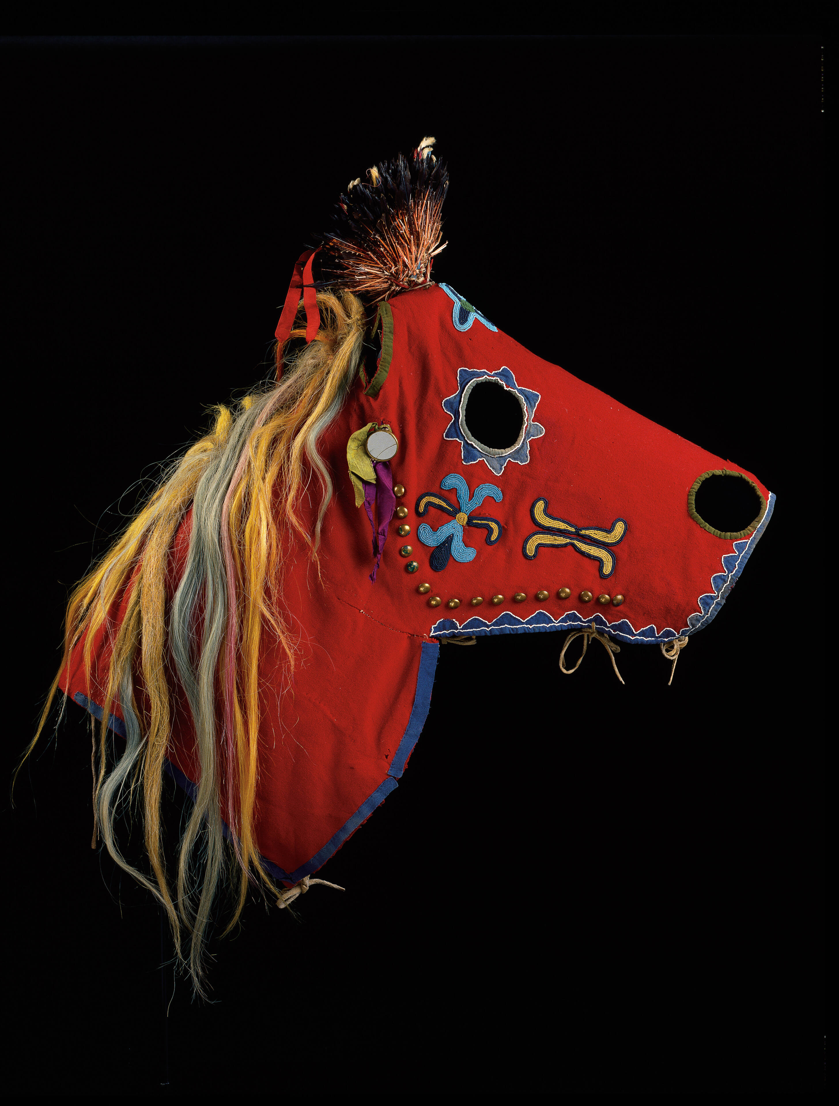Label TextHorse masks are perhaps the most spectacular Plains ceremonial horse trappings. A finely decorated mask was just one part of elaborate horse regalia. Such accoutrements both celebrated the importance of the horse and honored the artists who created them. Warriors originally rode masked and painted horses in processions as preparation for war. This process, an important part of the ritual associated with warfare, recognized the spiritual aspect of the horse. After the end of warfare in the 1880s, horse masks were worn for celebrations and parades.Exhibition History"The 45th Annual Winter Antique Show," New York, NY, January 12, 1999 – January 25, 1999.