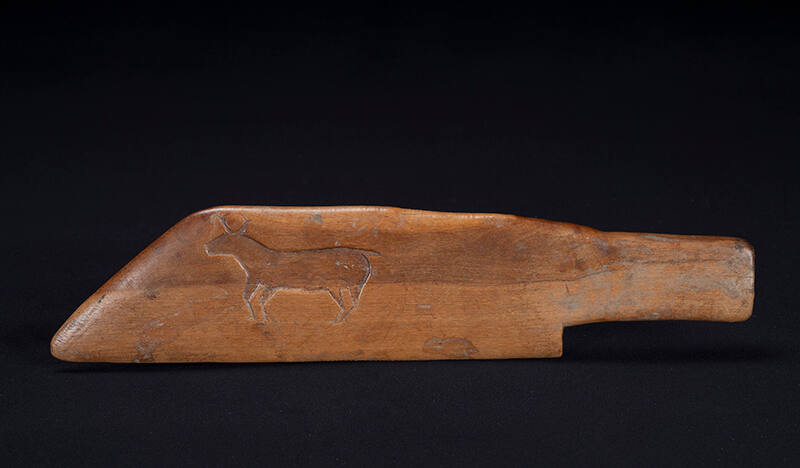 Label TextBattens, or "weaving swords," are thin strips of wood that are slipped between the warps to hold them apart and make a shed through which the weft yarns are passed. When the weft yarns are in place, the battens are used to pack them down and make the textile tight. These short batons were used with a narrow back loom, a type which is much older than the blanket loom and is still used for weaving sashes, belts, and decorated bands for ties. (c.f. Underhill 1944, pl.III-10; Kent 1983, fig.65) The warp threads are stretched on a frame, or from a tree or post, to a belt around the weaver, who adjusts the tension by his/her position. The belts have distinctive warp-faced designs. Good battens are highly prized by weavers and rarely decorated with carved designs like these. Dated and published examples are very rare, but the style of carving and amount of wear suggests a nineteenth-century date.