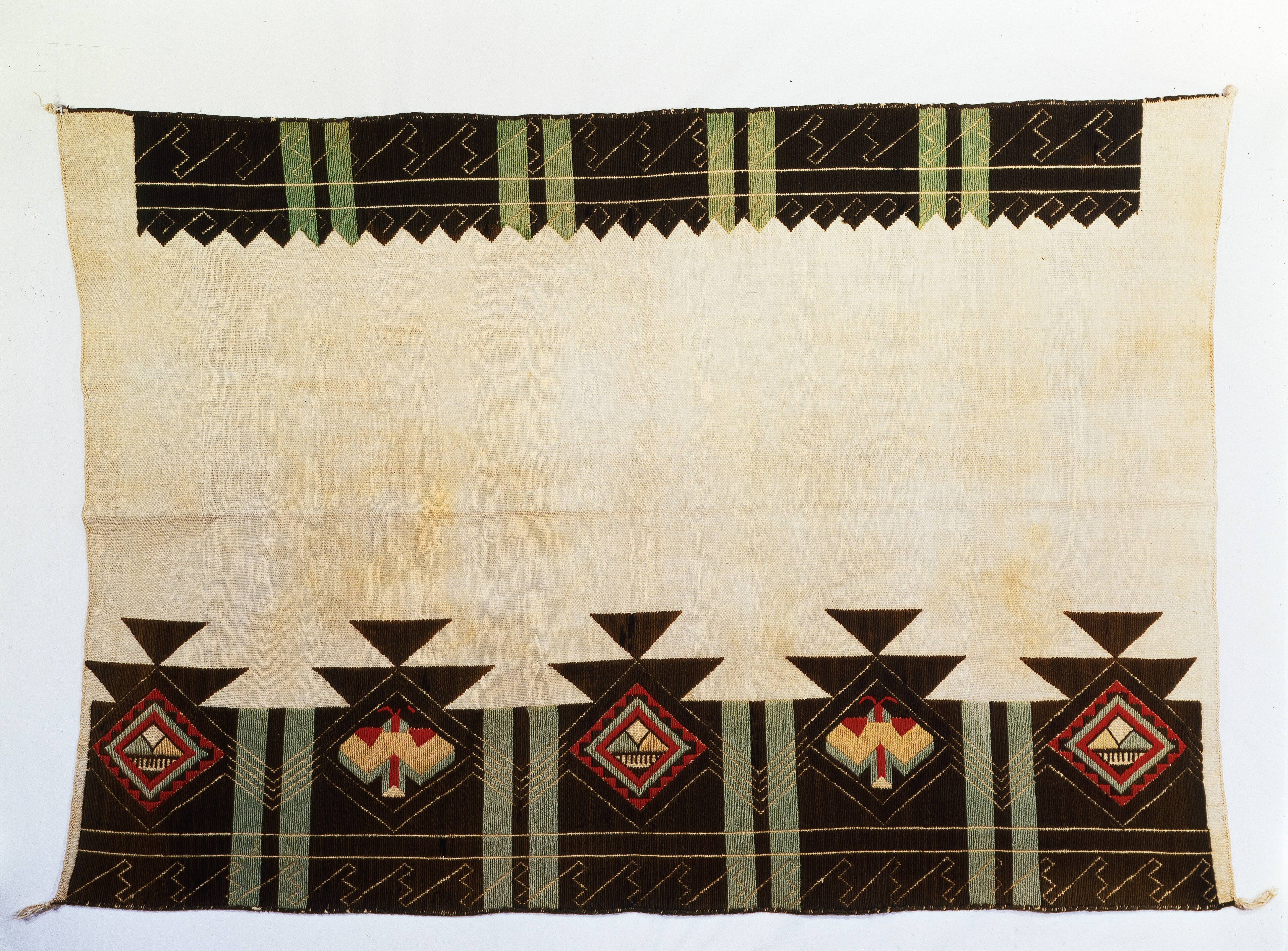 Label TextFrom prehistoric times mantas were an important article of trade and commerce in the pueblo region. Some garments were plain, but others, such as this one, were decorated with embroidery along their top and bottom edges. The lower section has five multicolored diamonds that enclose stylized butterflies and abstract rain clouds, symbols of fertility and renewal. Mantas are worn today at dances and other ceremonial events, though in the past they were worn daily.