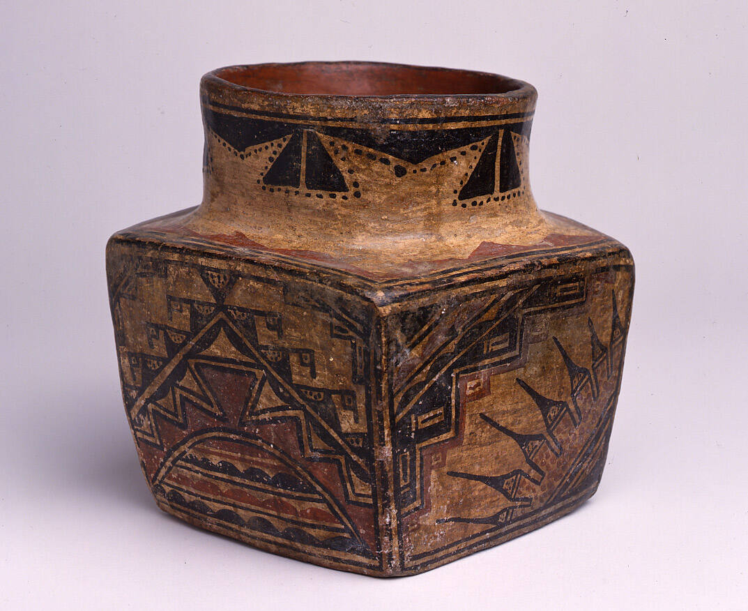 Label TextThis jar is a remarkable vessel, in both form and decoration. It was made at Santa Ana Pueblo, or possible at Zia, at the end of the 18th century or early in the 19th. The shape and the black and red painting on this jar are unique. The many small elements in the design would be unusual for Santa Ana and are more like Zia, although the vessel is tempered with fine sand, instead of the crushed basalt seen in most Zia pottery. The feather motifs and flagged triangles are rather similar to designs on early Ashiwi Polychrome made at Zuni. (From the Catalog of the Thaw Collection of American Indian Art, 2nd ed.)ProvenancePrivate collection, California; Ray Dewey, Santa Fe, New Mexico; Al Luckett, Jr., Santa Fe, New Mexico