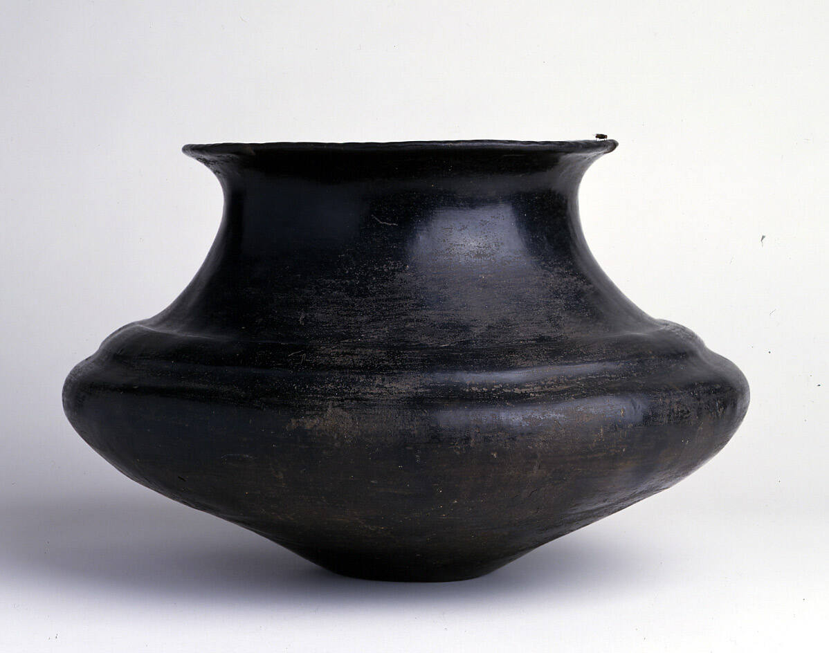 Label TextPueblo black pottery has been made for more than 300 years. Current research suggests black polished potter arrived with Oaxacan Indians who arrived in New Mexico in 1598 with Spanish colonists. It is this traditional blackware that helped form the basis for a surge in production and refinement stimulated by the inventions of Maria and Julian Martinez at San Ildefonso in 1919 and later. But well before this time, the Santa Clara potters were famous for their very large blackware vases and bowls. The pottery is made with the famous Tewa red clay containing ferric oxide. This clay becomes bright red when fired in an oxidizing atmosphere (i.e., oxygen reaches the pot during firing) and jet black when fired in a reducing atmosphere (i.e., without oxygen). This finely polished jar dates from about 1900. Although all the Tewa pueblos made black polished pottery, this elegant and beautifully balanced shape was made only at Santa Clara pueblo. The raised band on the shoulder is a rainbow, and implies around the rim are raindrops. The acute angle of the underbody gives this jar extraordinary refinement. This technique of impressing forms in the moist clay was distinctive of Santa Clare pottery. (From the Catalog of the Thaw Collection of American Indian Art, 2nd ed.)Exhibition History"Art Des Indiens D'Amerique Du Nord Dans La Collection D'Eugene Thaw," Mona Bismarck Foundation, Paris, France, Somogy Editions D'Art, January 21, 2000 - March 18, 2000.