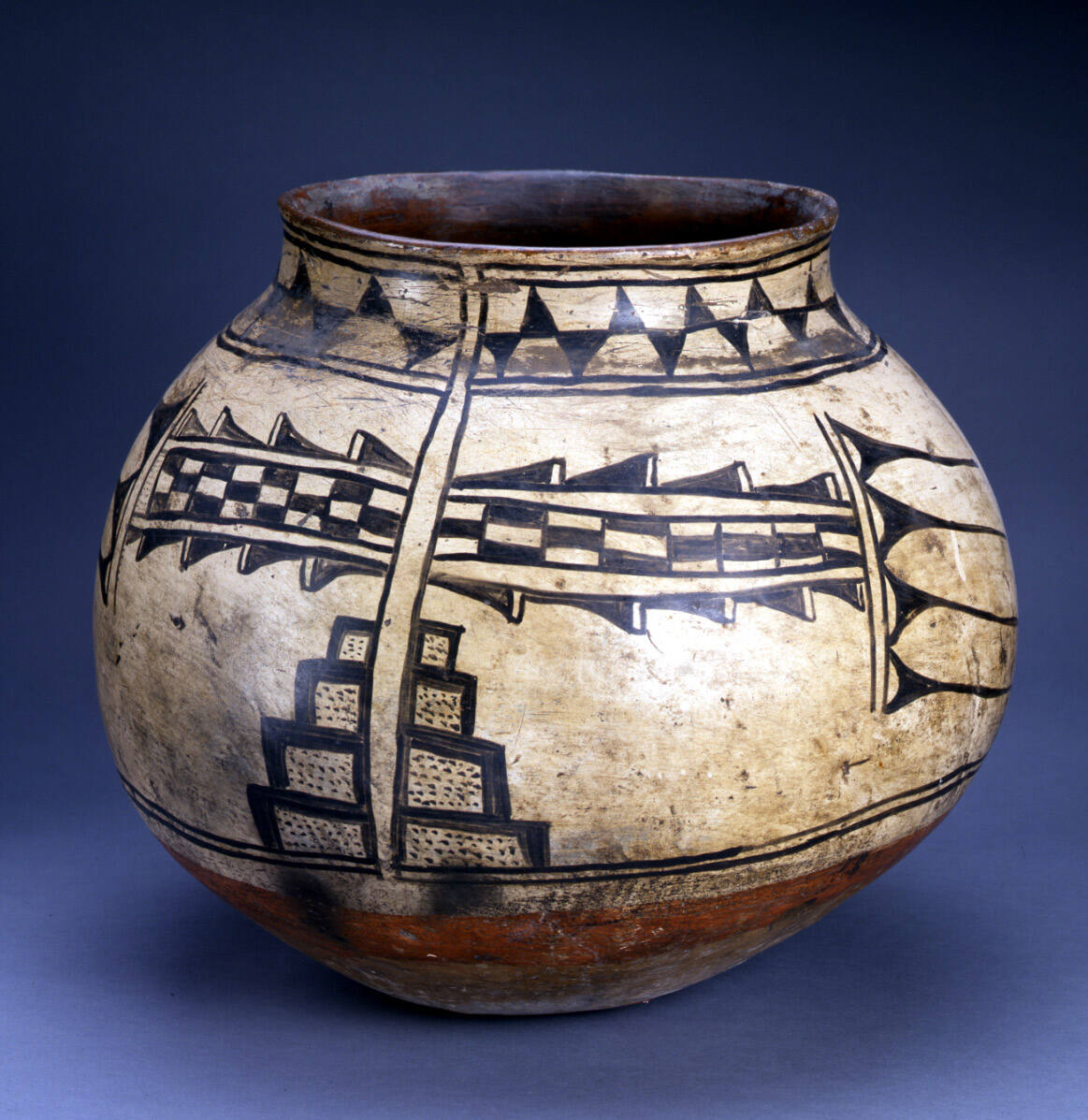 Label TextKiua is the ancient name for the pueblo of Santo Domingo, but Kiua Polychrome pottery was also made at nearby Cochiti and is ancestral to the wares made at both villages since 1800. The designs of Santo Domingo are more simple and bold than those of Cochiti. On this large storage jar the central band of small geometric figures terminating with a row of triangular "feathers", and the mutliple framing lines on this storage jar resemble the Cochiti style. The neck band and the ceremonial break cutting through the designs were common to both pueblos. Kiua Polychrome jars and bowls were covered with a creamy slip of rag-polished bentonite clay and decorated with black designs of organic paint made from Rocky Mountain beeweed (Cleome serrulata). The red underbody is stone polished and topped with a broad red band, and the rim is painted red. After 1800 the rims were generally black, but some red rims persisted to 1900. The red-brown paste is tempered with crystal pumice. Large jars, such as this, were important for storing and transporting wheat and corn. (c.f. Frank and Harlow 1974, p.81; Batkin 1987, p.96) This jar is a size that was almost standard in the 19th century. (From the Catalog of the Thaw Collection of American Indian Art, 2nd ed.)ProvenanceC.G. Wallace, Gallup, New Mexico; Richard Vander Wagens, Gallup, New Mexico; Larry Frank, Arroyo Hondo, New Mexico
