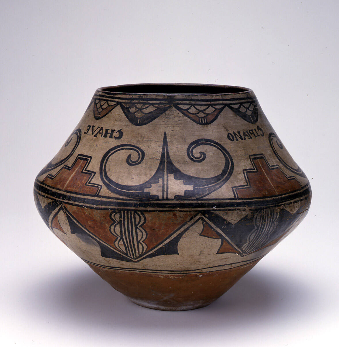 Label TextBeautifully painted black-and-red-on-buff pots are typical of this great pottery-making Pueblo between 1890 and 1910. Local clay was used with crushed volcanic ash temper. The red paint was a clay slip and the black was made with "guaco" of boiled Rocky Mountain bee-weed (Cleome serrulata). The combinations of angular and curvilinear motifs were arranged in two bands, separated by heavy black lines. The red base is separated from the upper buff section by a red line and the rim is painted black. Batkin is certain that the pot was made by Martina Vigil and Florentino Montoya. These two great potters lived at San Ildefonso until 1903 and then moved to Martina's home at Cochiti Pueblo. There they learned the rag-polishing technique and introduced to San Ildefonso where, to some extent, it replaced the old stone polish. (c.f. Batkin 1987, p.82) This vessel was made while they were still finishing their pots with stone polishing. Batkin has identified it as being made by Vigil and Montoya by certain distinctive elements: first, the generally fine finish, the excellent painting technique, and the use of recurrent motifs such as the cloud groups, the steps outlined with double lines, the pendant triangles around the rim, the scallops, and the use of negative space such as the steps in the base of the opposed scrolls. The name "Cipiano (Cipriano?) Chave (Chavez?)" probably signified a commission or a gift. (From the Catalog of the Thaw Collection of American Indian Art, 2nd ed.)ProvenancePaul Sarkisian, Santa Fe, New Mexico