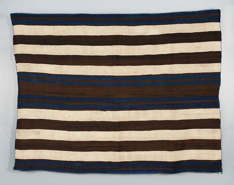 Mantas were essential items of clothing for both women and men. A First Phase blanket is woven with striped bands. The white and brown tones come from natural sheep wools color, the black is dyed with natural coloring and the blue is dyed with indigo imported from Mexico.