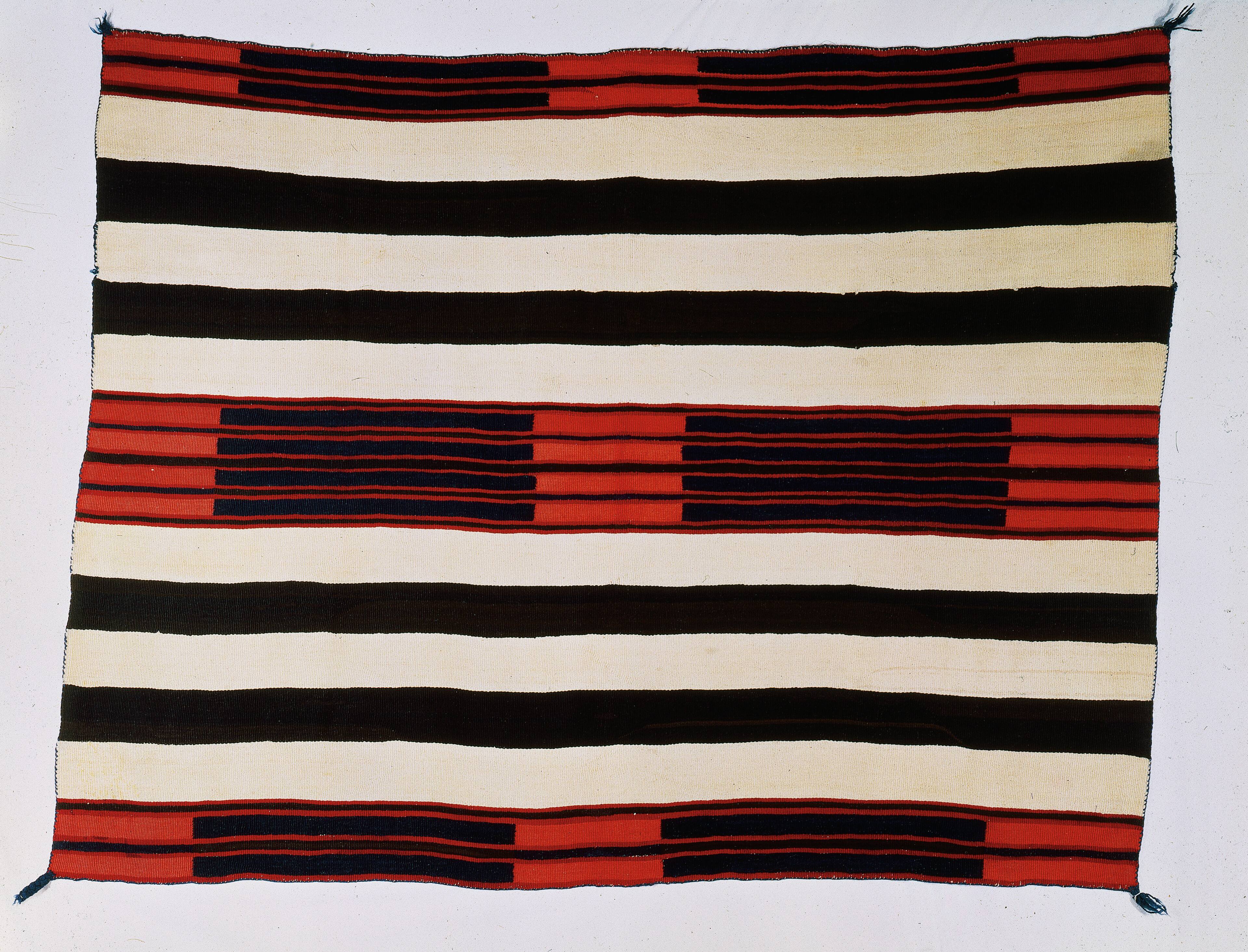 Diné Chiefs’ blankets the most recognizable of all Diné weavings were eagerly sought more than a century and a half ago by other Native Americans and since then by collectors, tourists and travelers. Second Phase Navajo Chiefs’ blankets are a transition in Diné aesthetics from the earlier First Phase adding boxes, rectangles or diamonds to the simple striping of the First Phase blanket design.