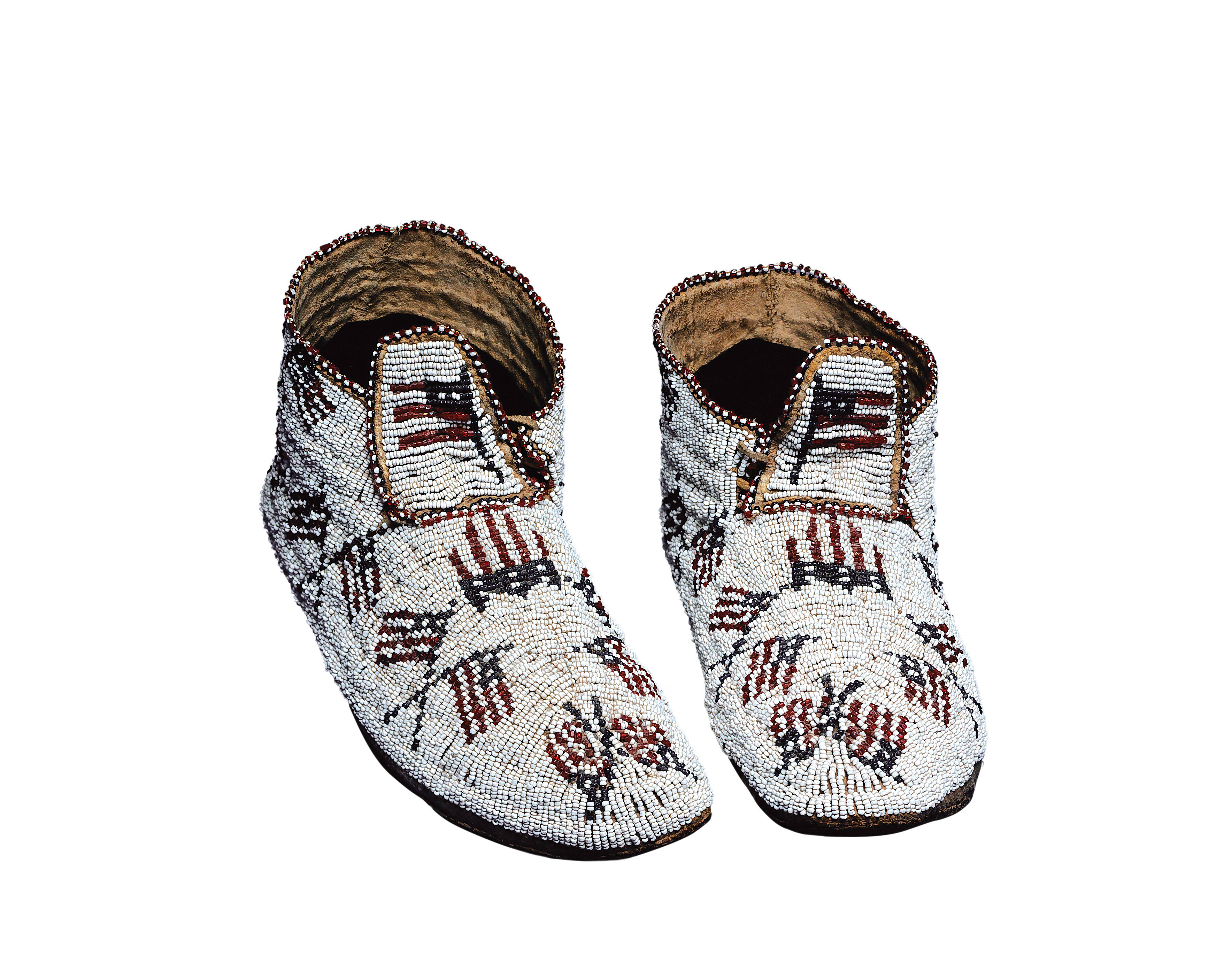 Label TextThis pair of moccasins with its white background and bold design elements, in this case crossed American flags, exemplifies Southern Cheyenne beadwork. The Southern Cheyenne placed a high cultural and social value on a woman’s ability to design and execute beadwork with great technical skill.Exhibition HistoryMuseum of Our National Heritage, Lexington, MA, December 6, 1994 - May 2, 1995.