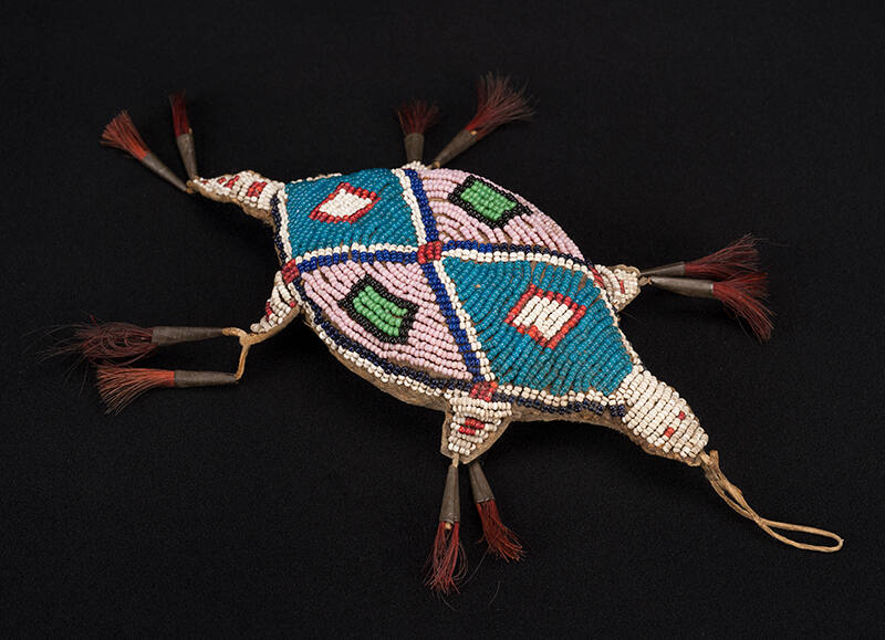 Label TextPlains mothers entrusted small beaded amulets to hold their baby’s dried umbilical cord, the precious life line between mother and child. Inside the amulet, the cord’s protective qualities warded off sickness and brought good luck to the child. Amulets were either attached to the child’s cradle or clothing. Beaded lizard and snake amulets were given to boys, while girls received beaded turtles such as this one.ProvenanceAlyse S. McDougall, San Anselmo, California; Gary Spratt, Rutherford, California