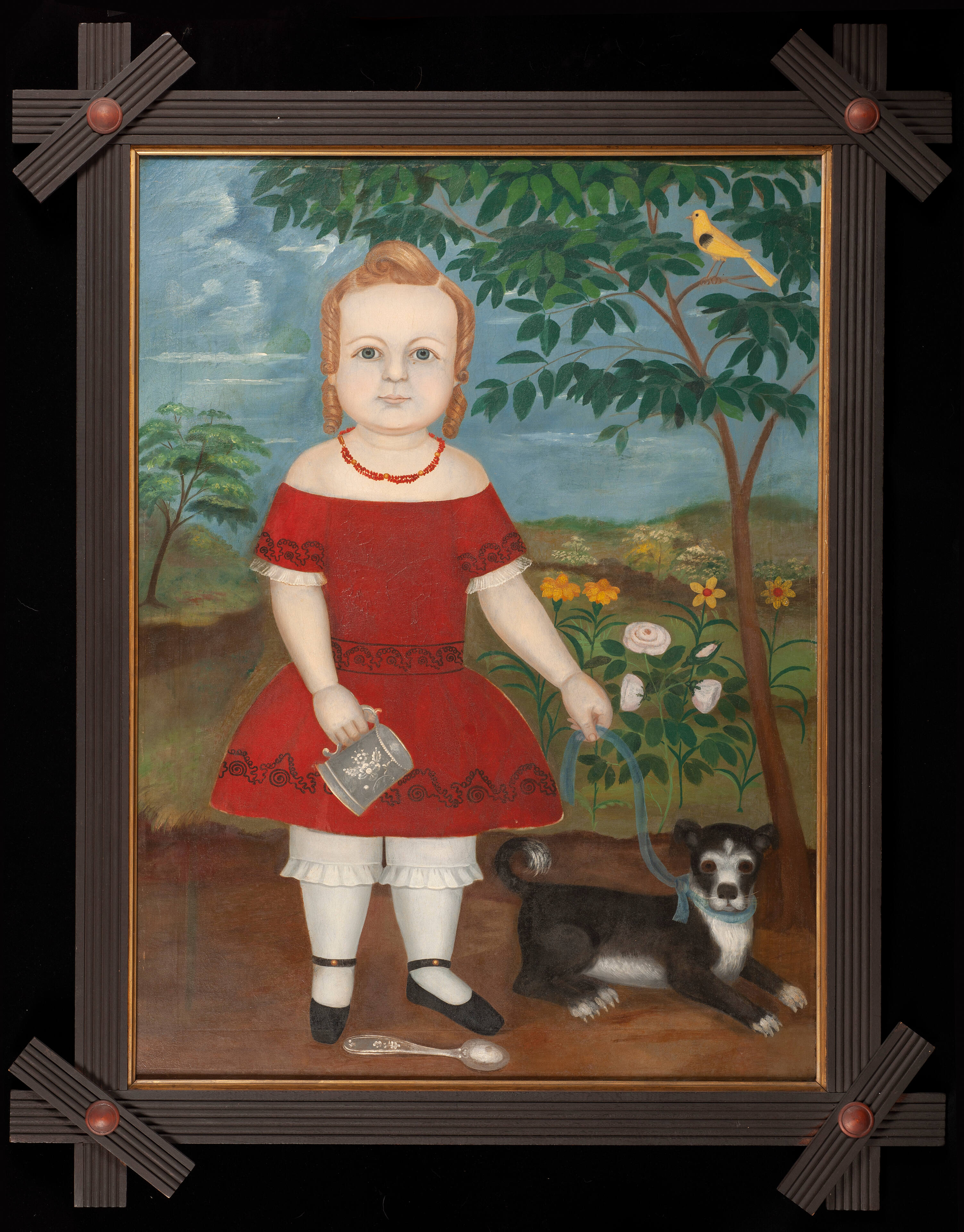 Active, playful pets enliven many of Miller's works. "Walking the Puppy" exhibits the artist's characteristically colorful, detailed background scenes, including the distinctively stylized foliage, nearly identical finches, vaguely suggested hills, a body of water and a stylized one and one-half story structure. Miller's interiors are rendered with solid areas of color defining the walls and floor, and typically include a drapery swag, tassel and a window revealing a brightly colored landscape vista. A variety of props and accessories further embellishes the likenesses, including the basket of flowers, cup, spoon and coral necklaces. The meticulously rendered lacework and embroidery of the costumes adds greatly to their visual appealExhibition History“Is She or Isn’t He? Identifying Gender in Folk Portraits of Children,” Heritage Plantation of Sandwich, Sandwich, MA, May 13, 1995 – October 29, 1995.