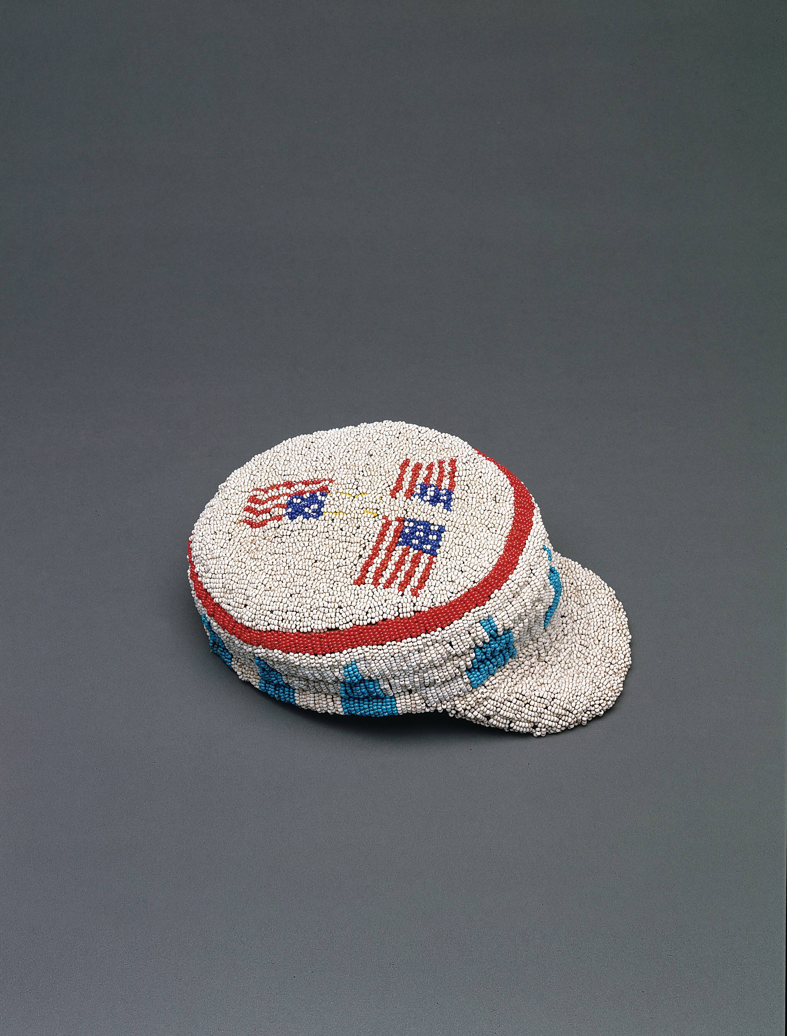 Label TextThe American flag has always been an important patriotic symbol of the United States. For Native Americans, however, the flag has had a number of meanings. During the 1860s when warfare between Plains Indians and the U.S. Army escalated, Plains men captured American flags from the army and made decorative use of flag imagery to demonstrate their success as warriors. Around the same time Native American women also began to incorporate the image of the flag on objects such as baskets, pin cushions, and rugs that they made for sale to American tourists.The cap, although commercially produced, shows the Lakota people’s adaptation of European clothing that they would decorate with their own styles. A high cultural and social value was placed on a woman’s ability to design and execute beadwork with great technical skill. Beadwork continues to be an important creative expression for women to affirm their Native identity, celebrate their skills, and show their love for their children.