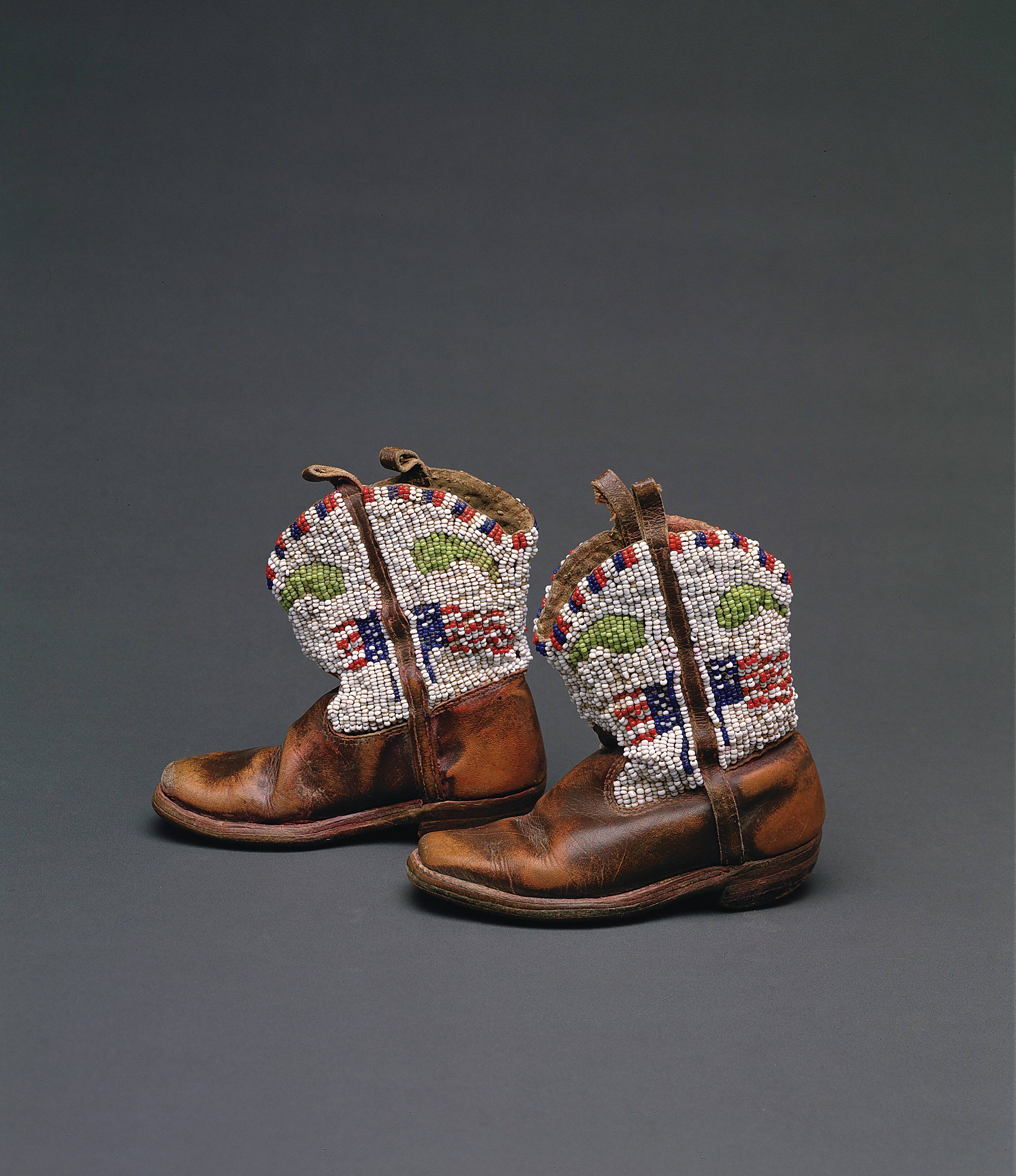 Label TextIn the 1890s, Lakota people were forced to adjust to life on the reservation, in which many of their traditional activities were no longer possible. Women, however, had greater outlets for traditional life than men. Beadwork was an important creative expression for women, allowing them to affirm their Native identity, celebrate their skills, and show their love for their children. This pair of child’s cowboy boots was adapted to Lakota taste by the addition of beadwork.Exhibition HistoryMuseum of Our National Heritage, Lexington, MA, December 6, 1994 - May 2, 1995.