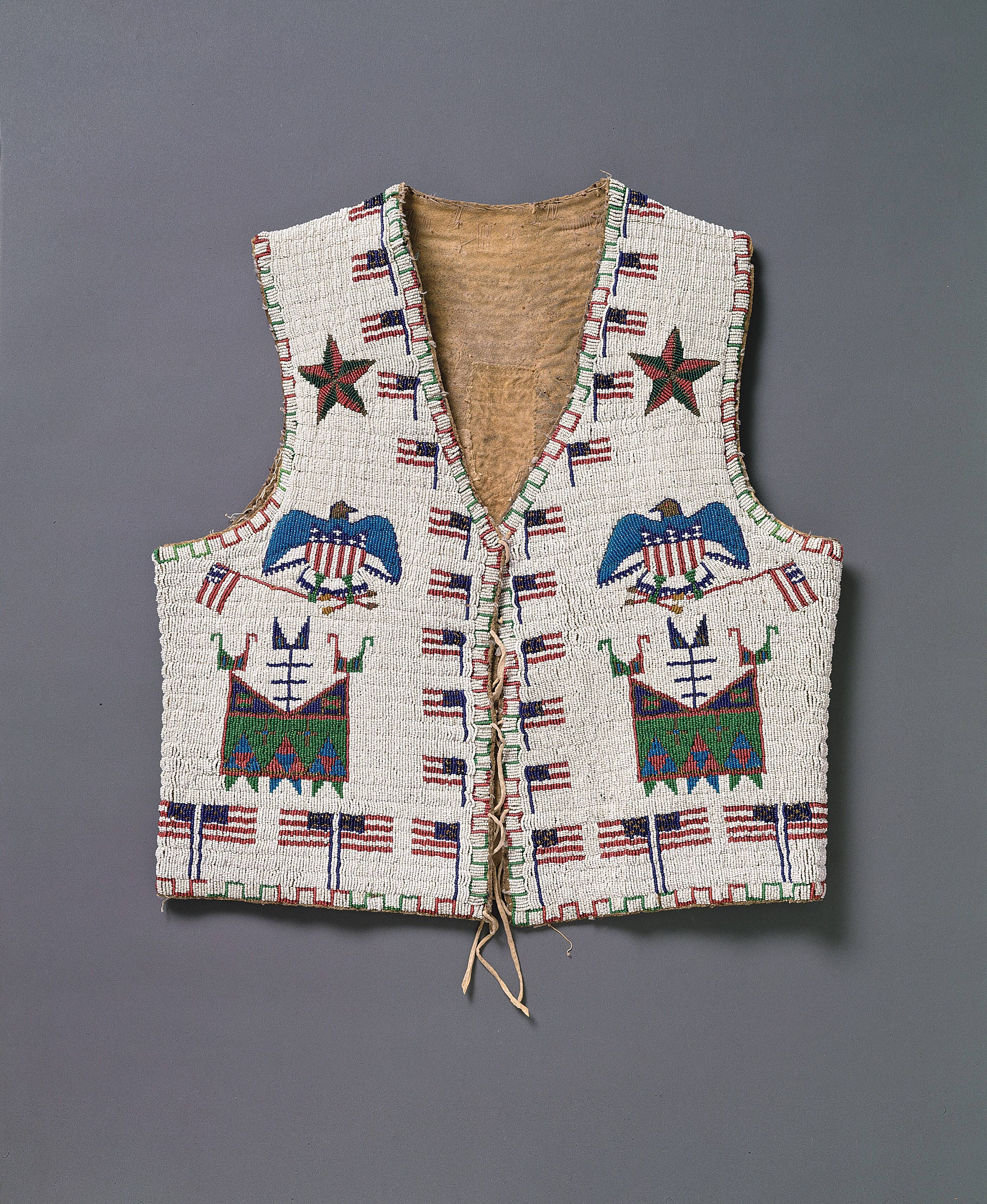 On the back of this vest a Sioux warrior and a U.S Army officer meet and acknowledge their allegiance by touching war lance to flag. The Sioux warrior is highly decorated with an eagle warbonnet and eagle feathers attached to his war lance and his war horse’s tail. He seems to be wearing a vest very much like the one on which this scene is portrayed. The letters “W.U.B.N.” across the shoulders are the initials of the original owner. Exhibition HistoryMuseum of Our National Heritage, Lexington, MA, December 6, 1994 - May 2, 1995.