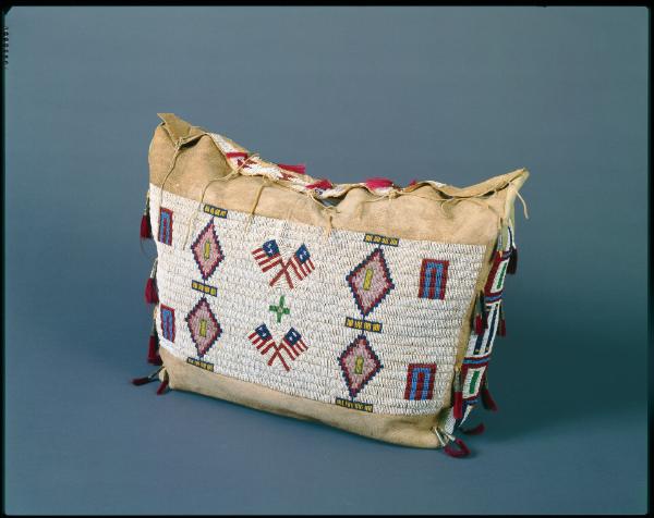 Label TextEarly 19th century traders called these rectangular soft-skin containers “Possible Bags.” A more accurate term might be storage or tipi bag, as they held personal items and were placed inside the tipi where they doubled as pillows. When moving camp the bags were hung on the side of a saddle, where their decorations could be seen and admired.Exhibition HistoryMuseum of Our National Heritage, Lexington, MA, December 6, 1994 - May 2, 1995.